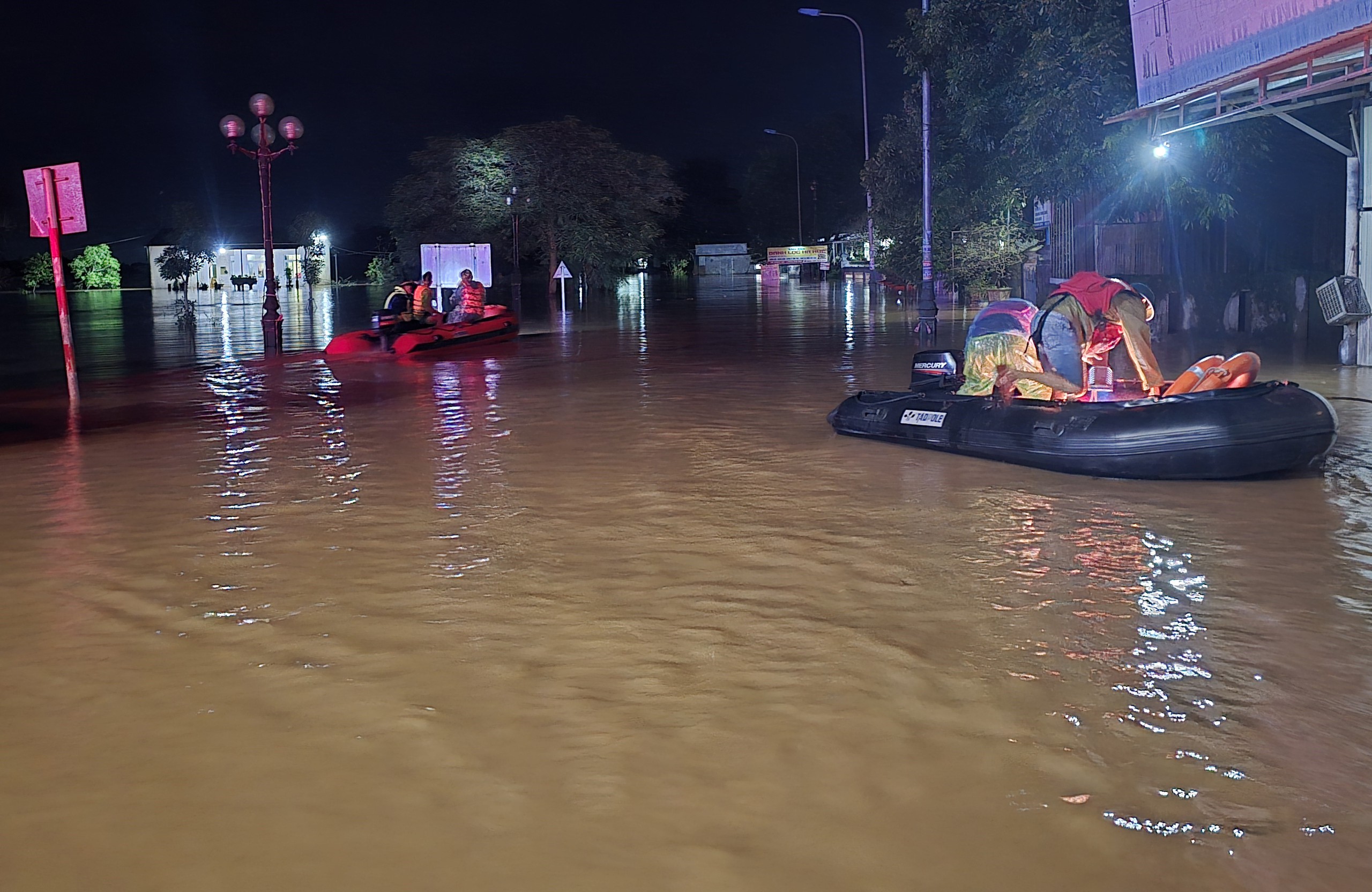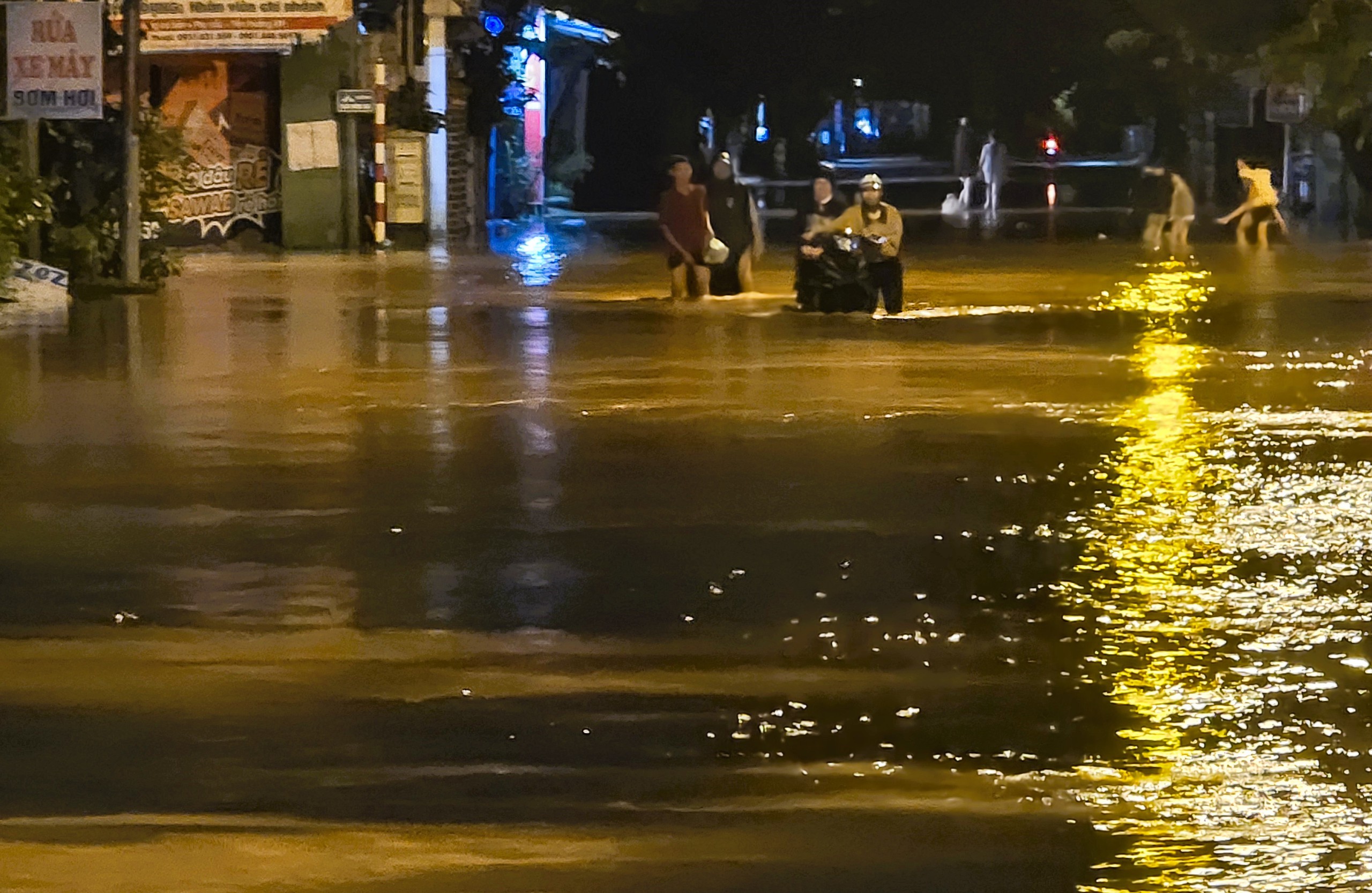 Tuyến đường Ngô Quyền đoạn từ cầu Thành Cổ về Khu lưu niệm Tổng Bí thư Lê Duẩn đang ngập sâu. Tại đây, lực lượng tình nguyện đang sử dụng xuồng ca nô hơi di chuyển về khu vực dọc sông để đưa người dân đi cấp cứu.