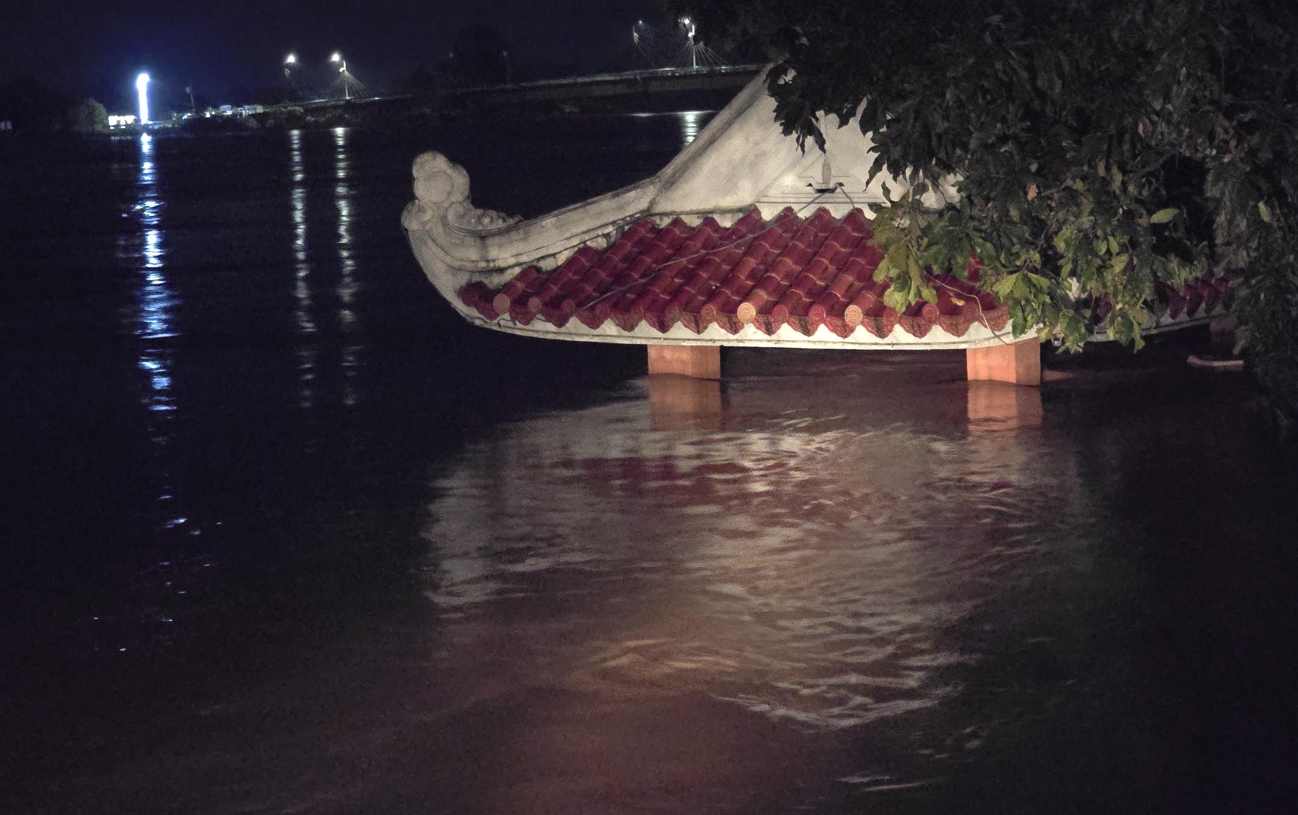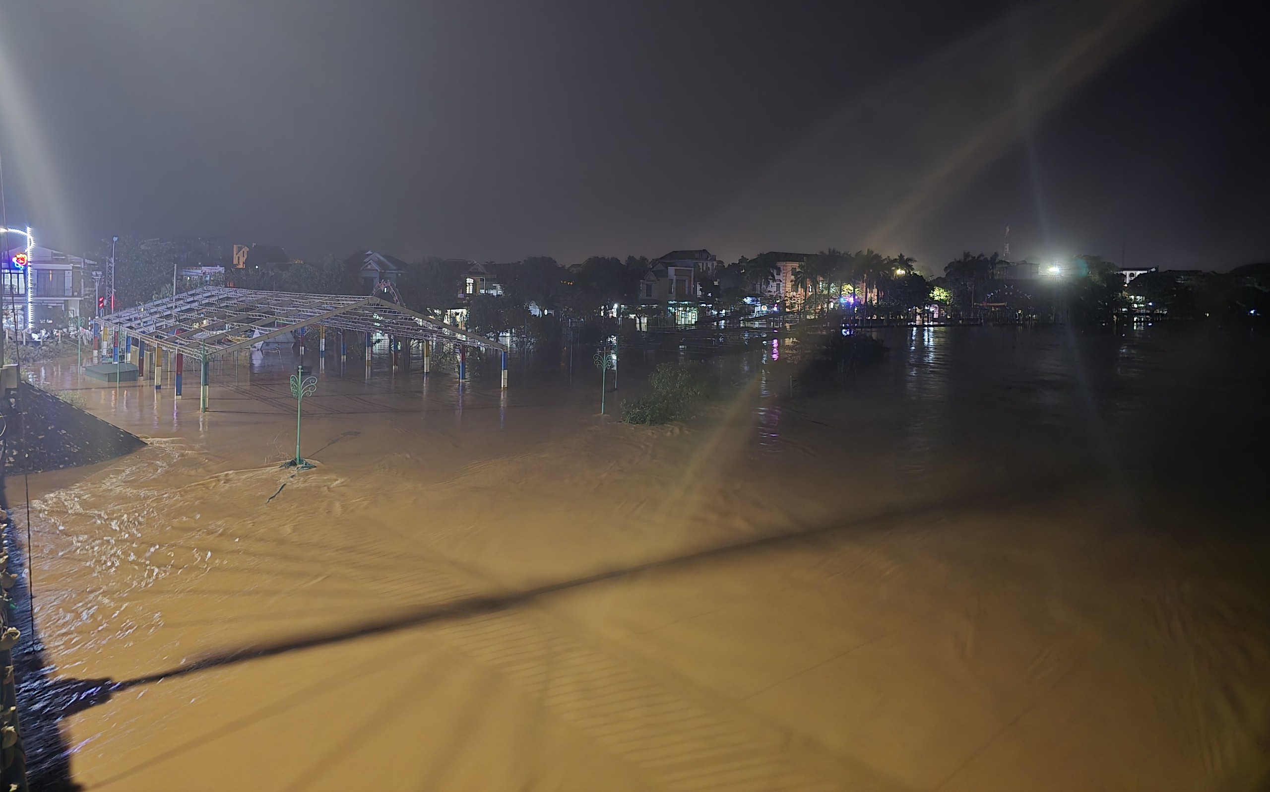 Nước lũ gần chạm mái nhà Bến thả hoa ở bờ Nam sông Thạch Hãn.