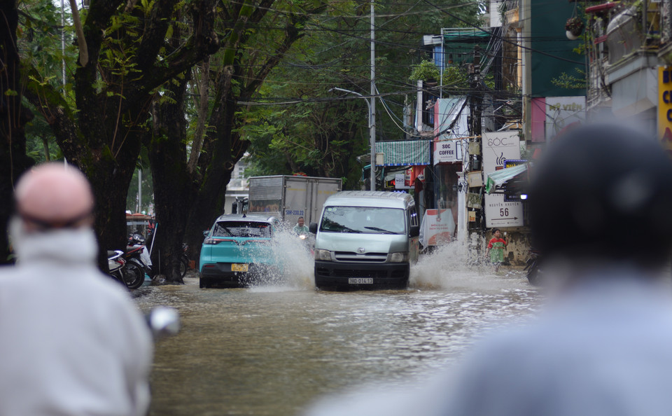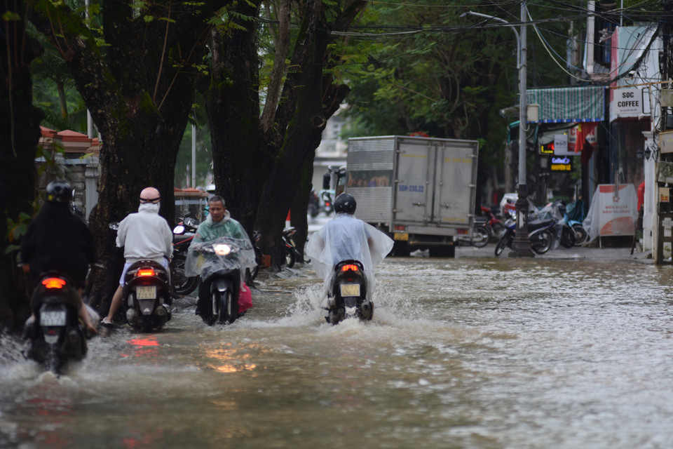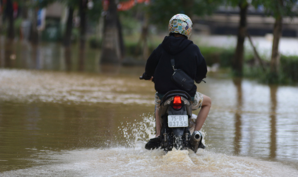 Đoạn đường Nguyễn Khuyến (phường Thận Hóa, thành phố Huế) ngập sâu, ảnh hưởng đến việc di chuyển của các phương tiện. (Ảnh: Văn Dũng/TTXVN)