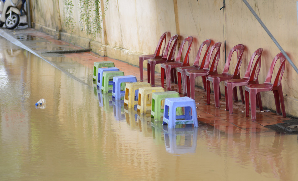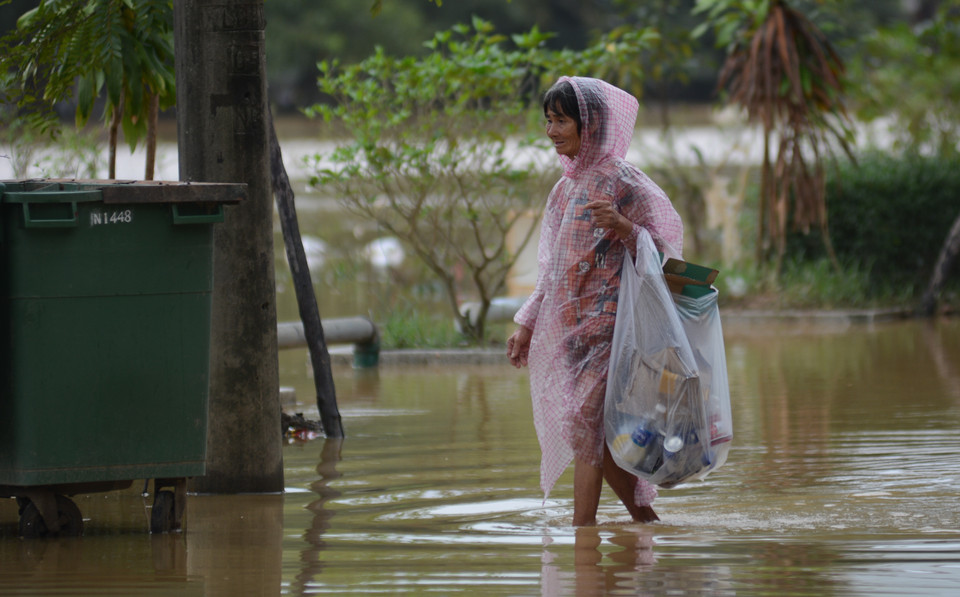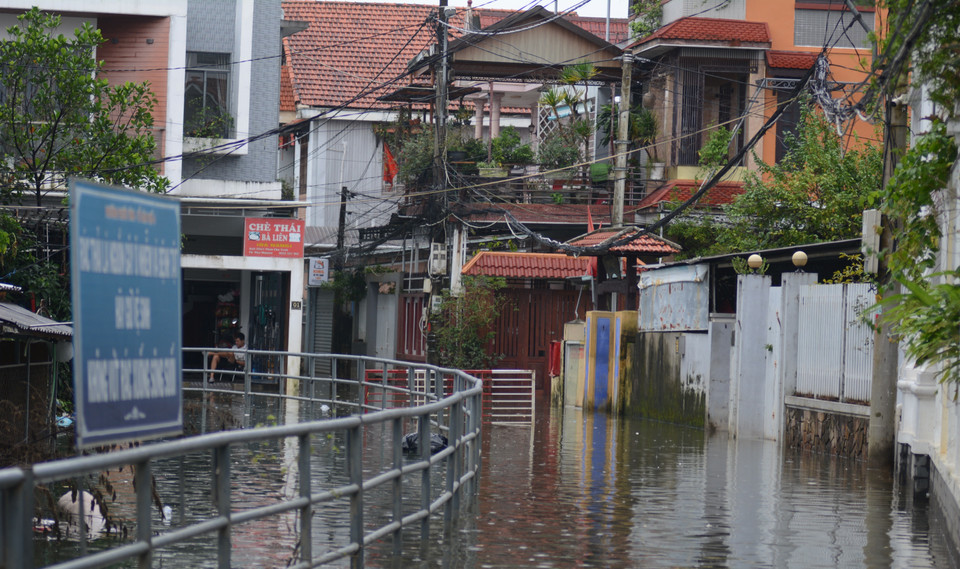 Một con ngõ trên đường Phan Châu Trinh bị ngập sâu, khiến người dân bị cô lập. (Ảnh: Văn Dũng/TTXVN)