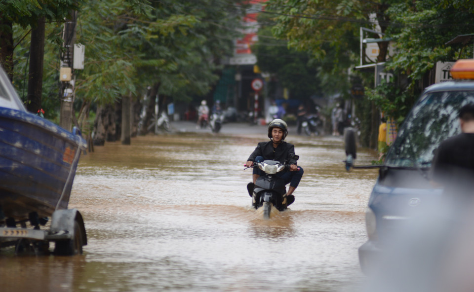 Đoạn đường Nguyễn Khuyến (phường Thận Hóa, thành phố Huế) ngập sâu, các phương tiện di chuyển khó khăn. (Ảnh: Văn Dũng/TTXVN)