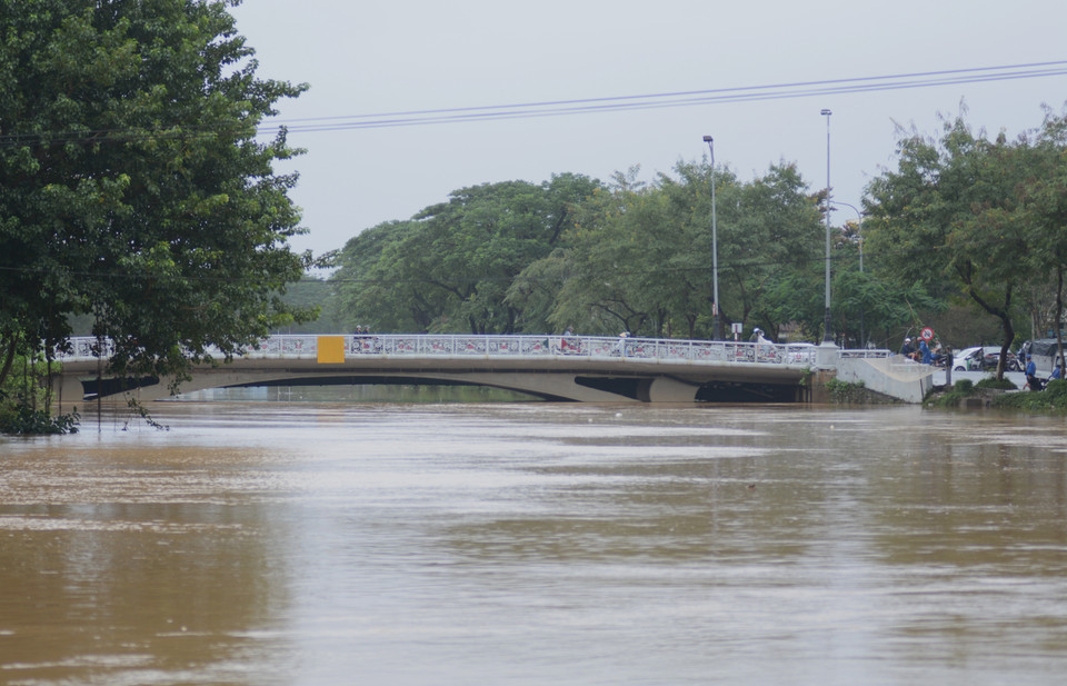 Nước lũ trên sông An Cựu dâng cao khiến các tuyến đường ven sông bị ngập sâu. (Ảnh: Văn Dũng/TTXVN)