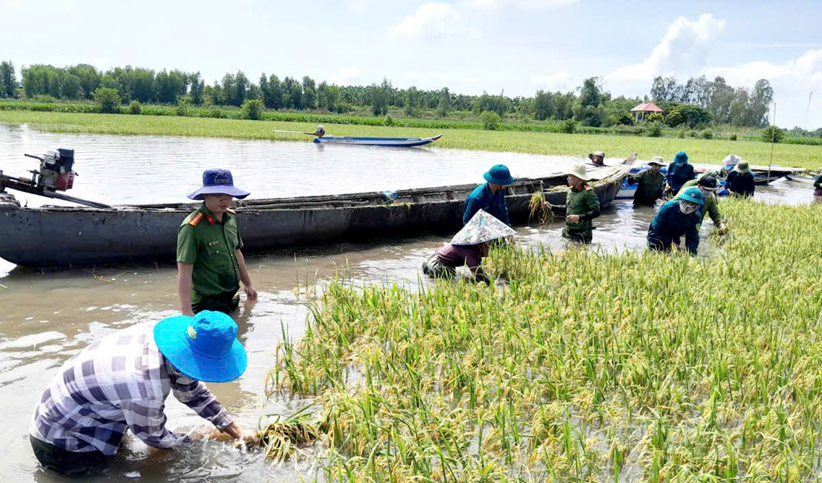 Các lực lượng ở Tây Ninh giúp dân thu hoạch lúa trong nước lũ