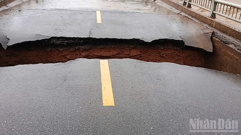 Vụ sạt lở đã làm hư hỏng gần như hoàn toàn mặt đường, tạo thành một hố sâu rất nguy hiểm.