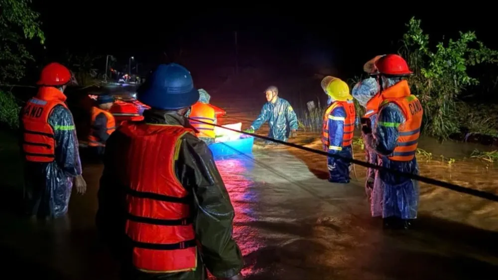 Lực lượng chức năng hỗ trợ, sơ tán người dân trong đêm. Ảnh: M.M