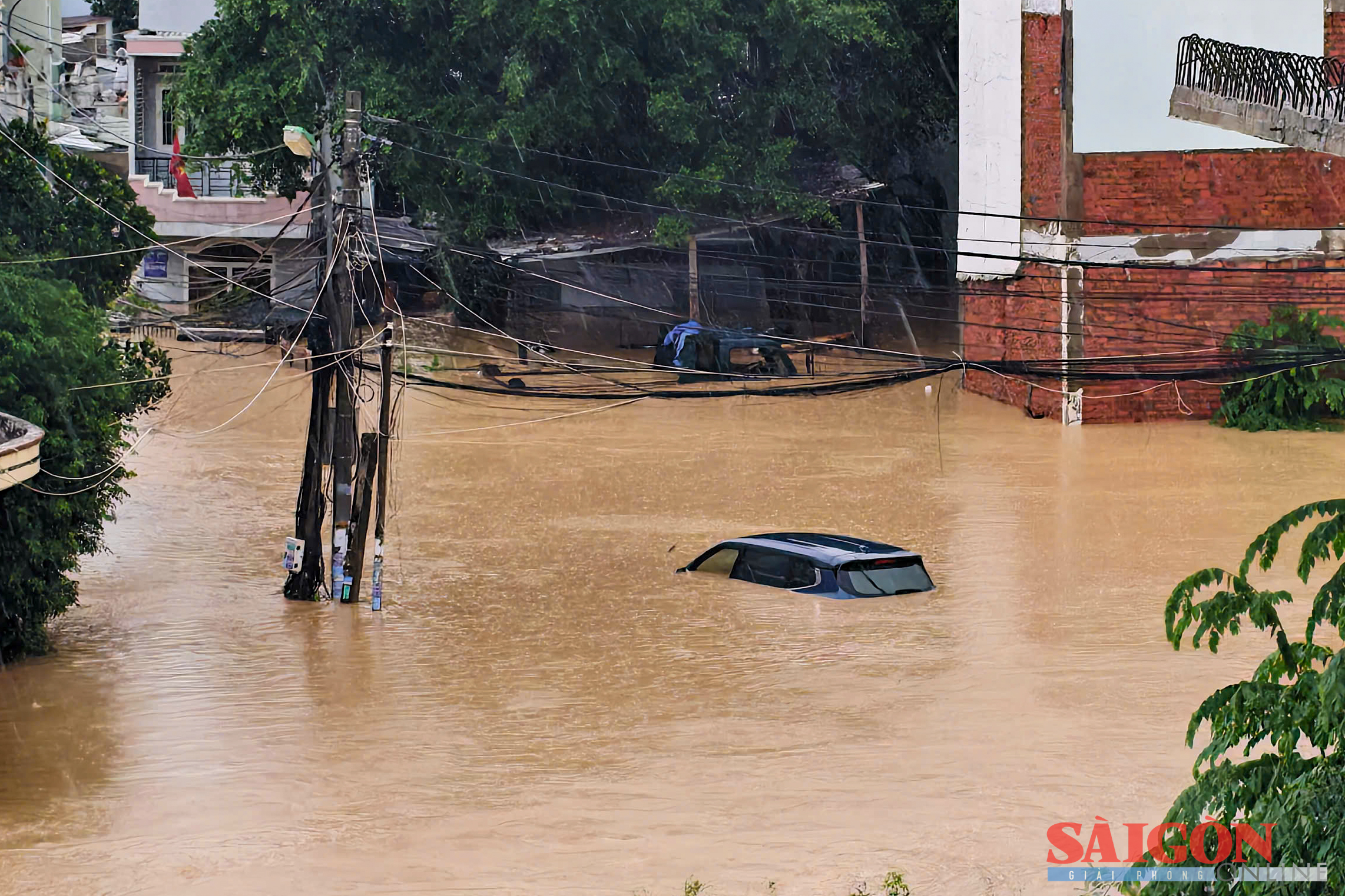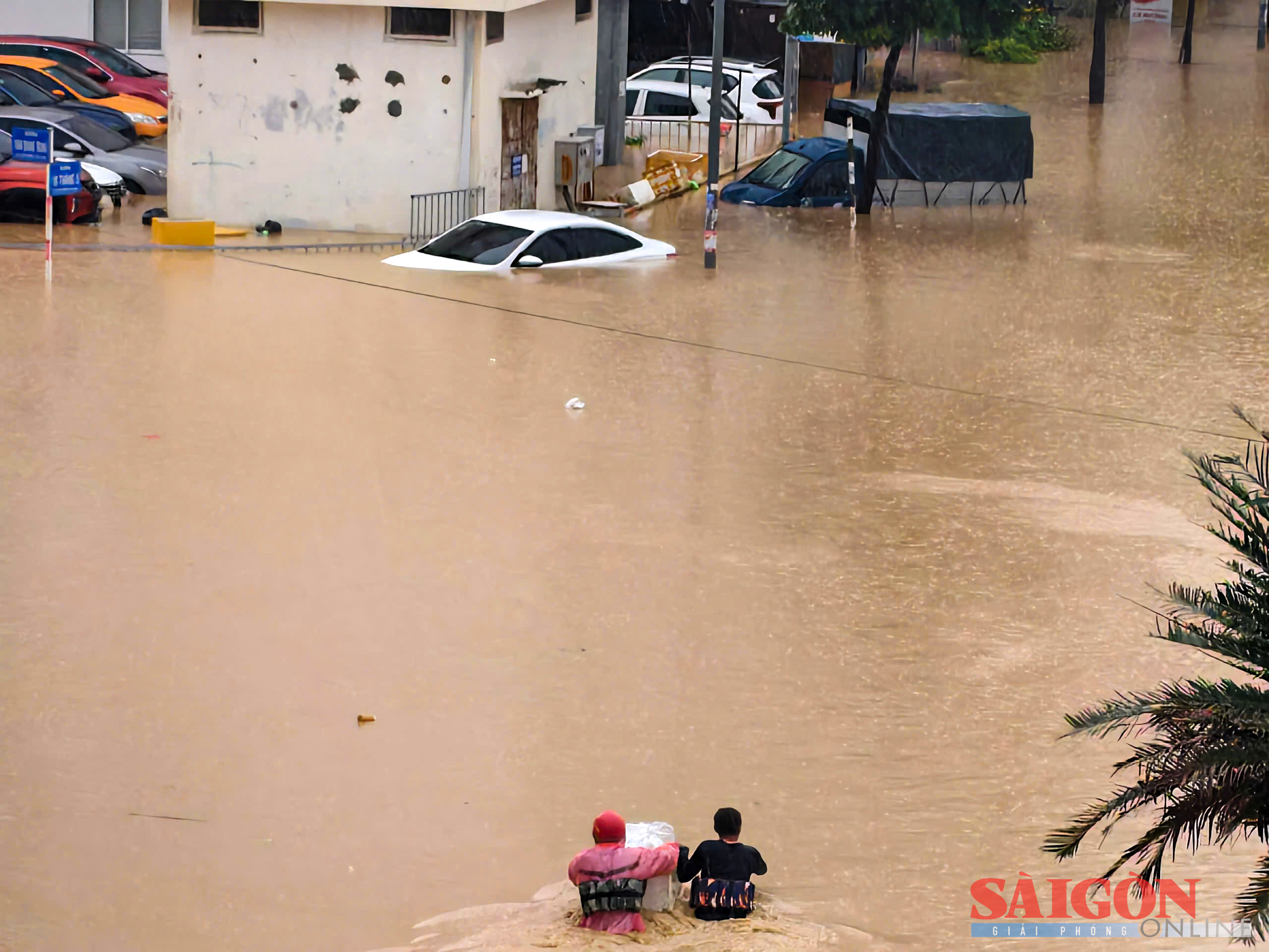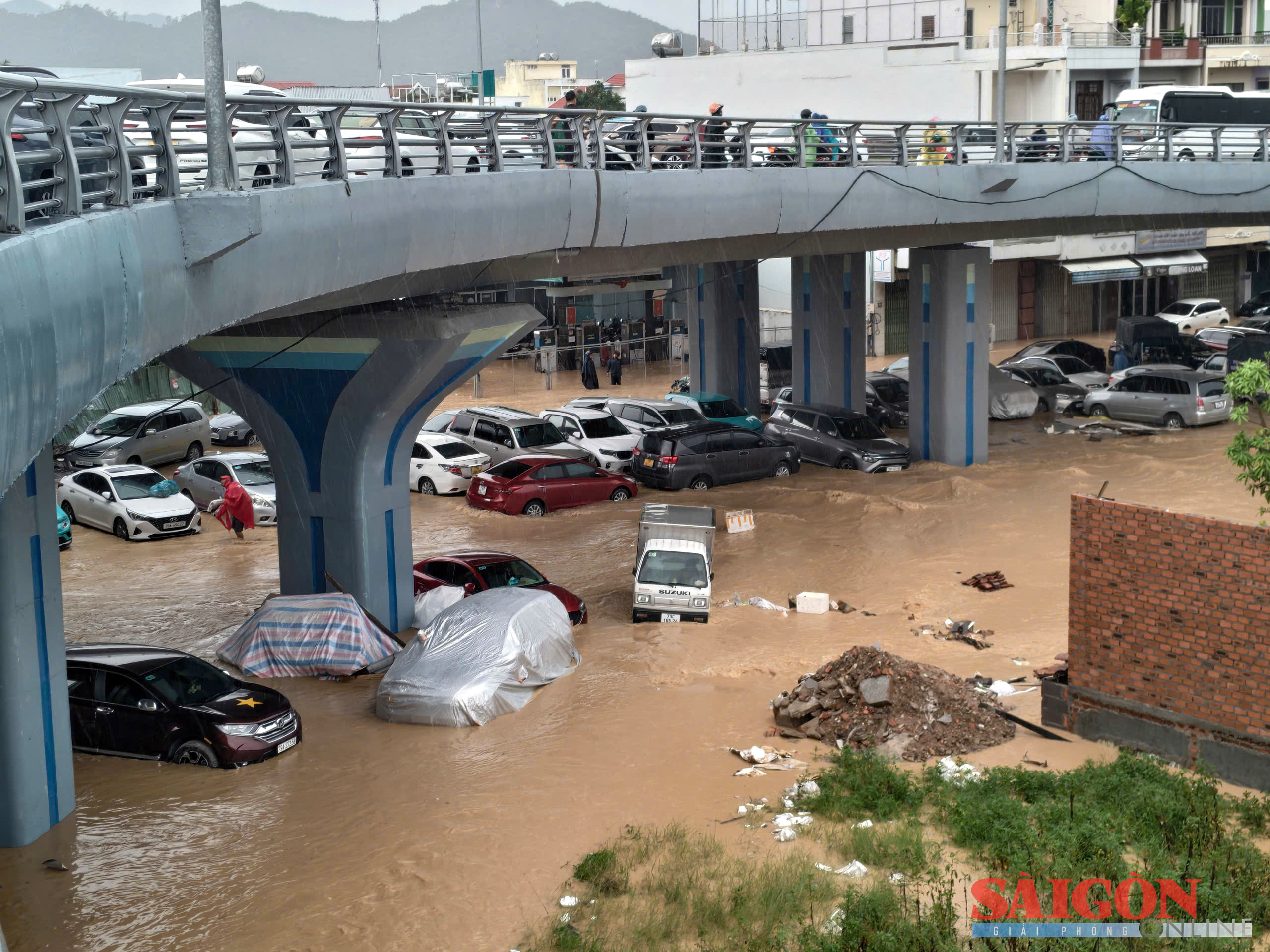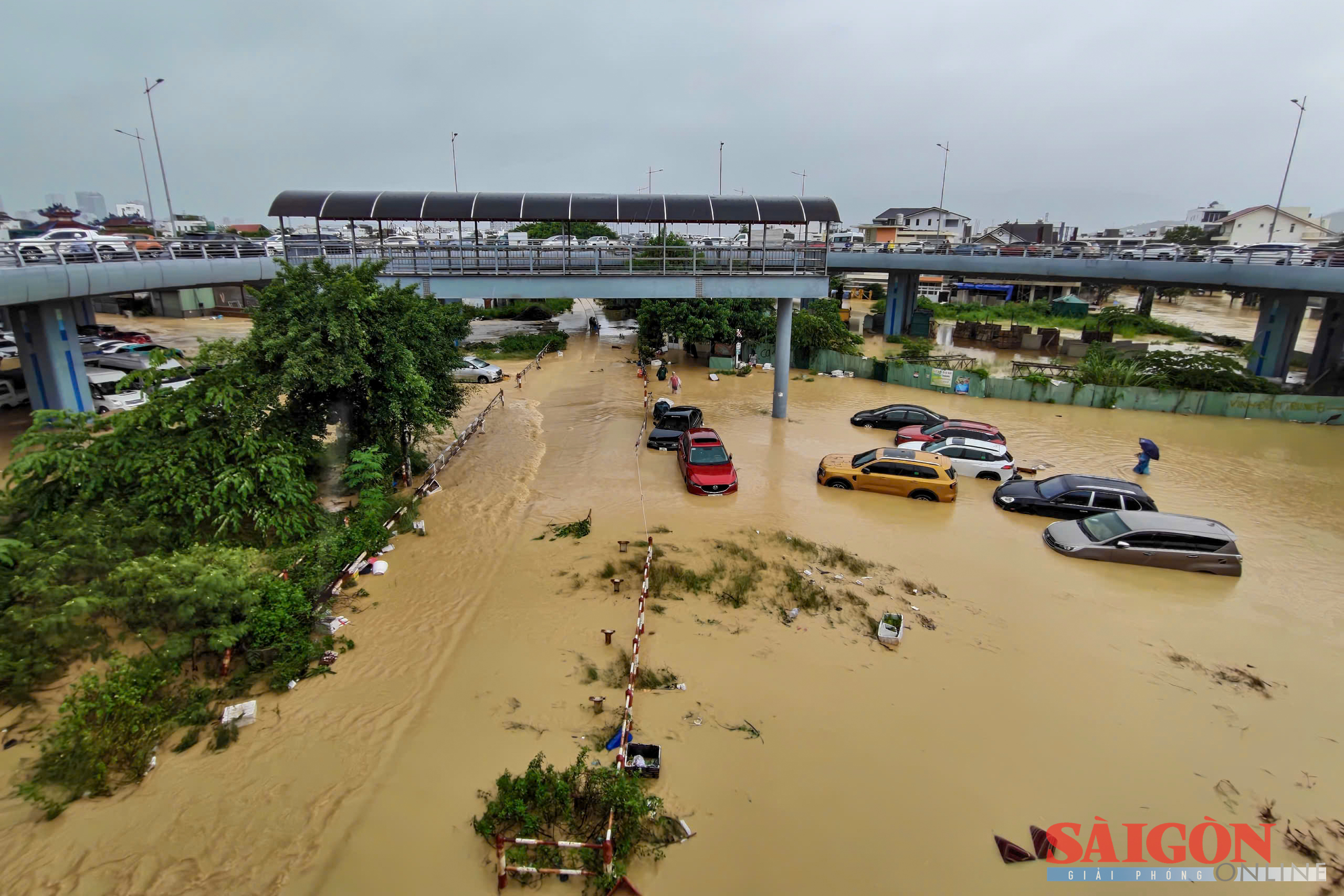 Ghi nhận của phóng viên Báo SGGP, khu vực siêu thị Go! (khu đô thị Vĩnh Điềm Trung, phường Tây Nha Trang) chìm trong nước. Hàng trăm xe ô tô chết máy do lũ dâng cao hơn 1m.