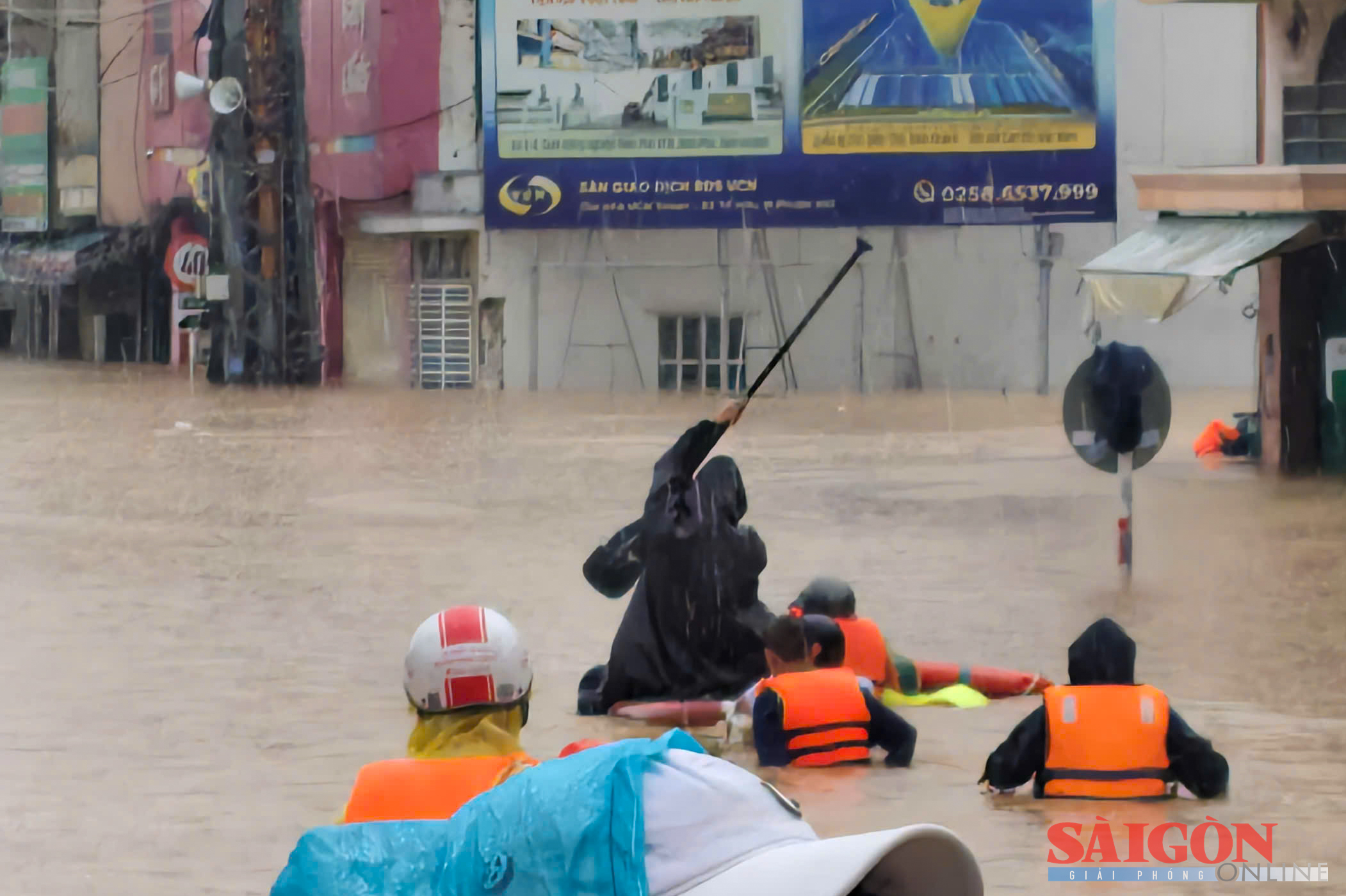 Lực lượng cứu hộ nhanh chóng vào các khu dân cư khu vực Tây Nha Trang, đưa người dân đến nơi an toàn. Ảnh: HIẾU GIANG