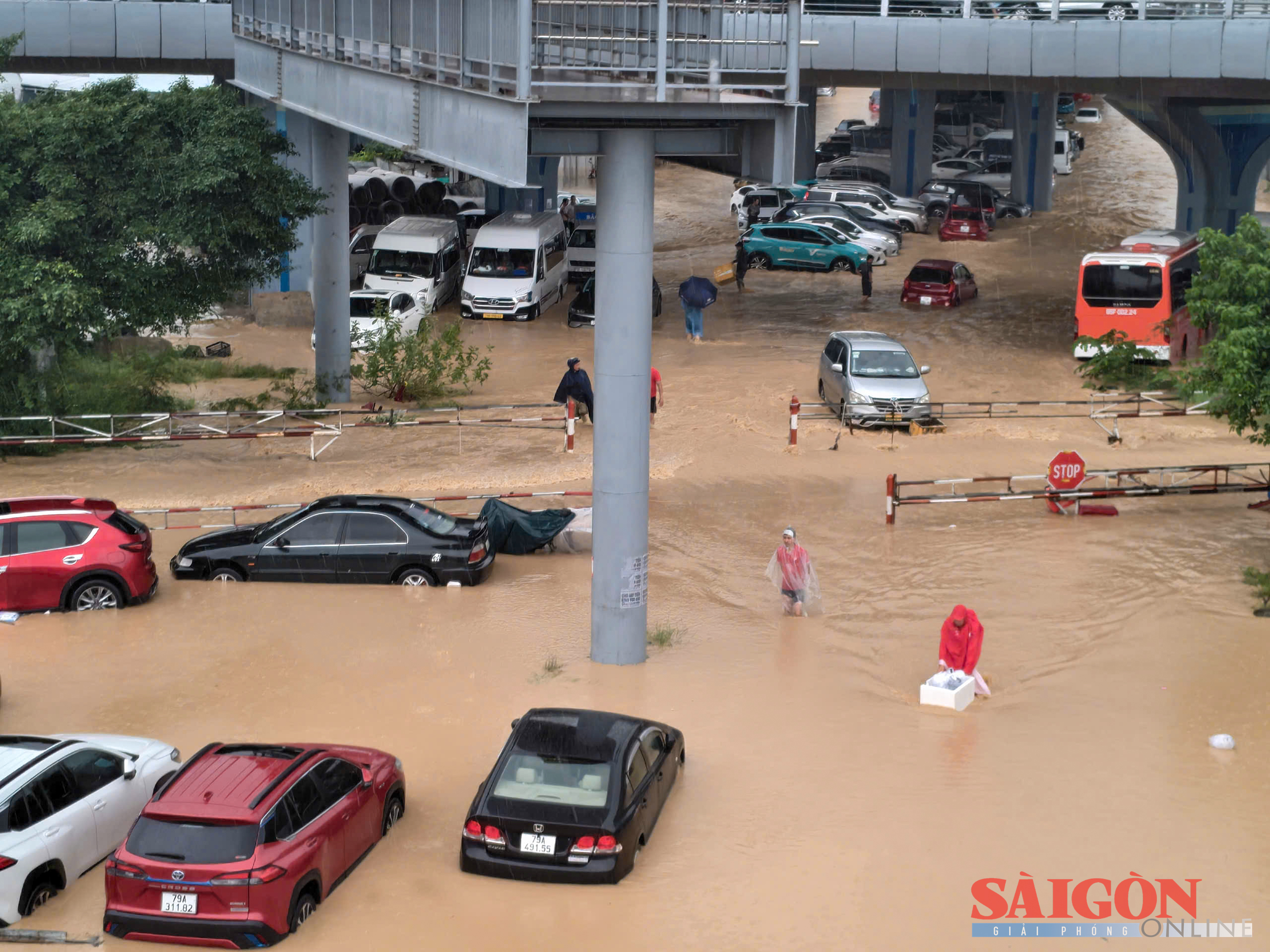 Phía trên nút giao cầu vượt này có hàng trăm xe ô tô đậu tránh ngập. Ảnh: HIẾU GIANG