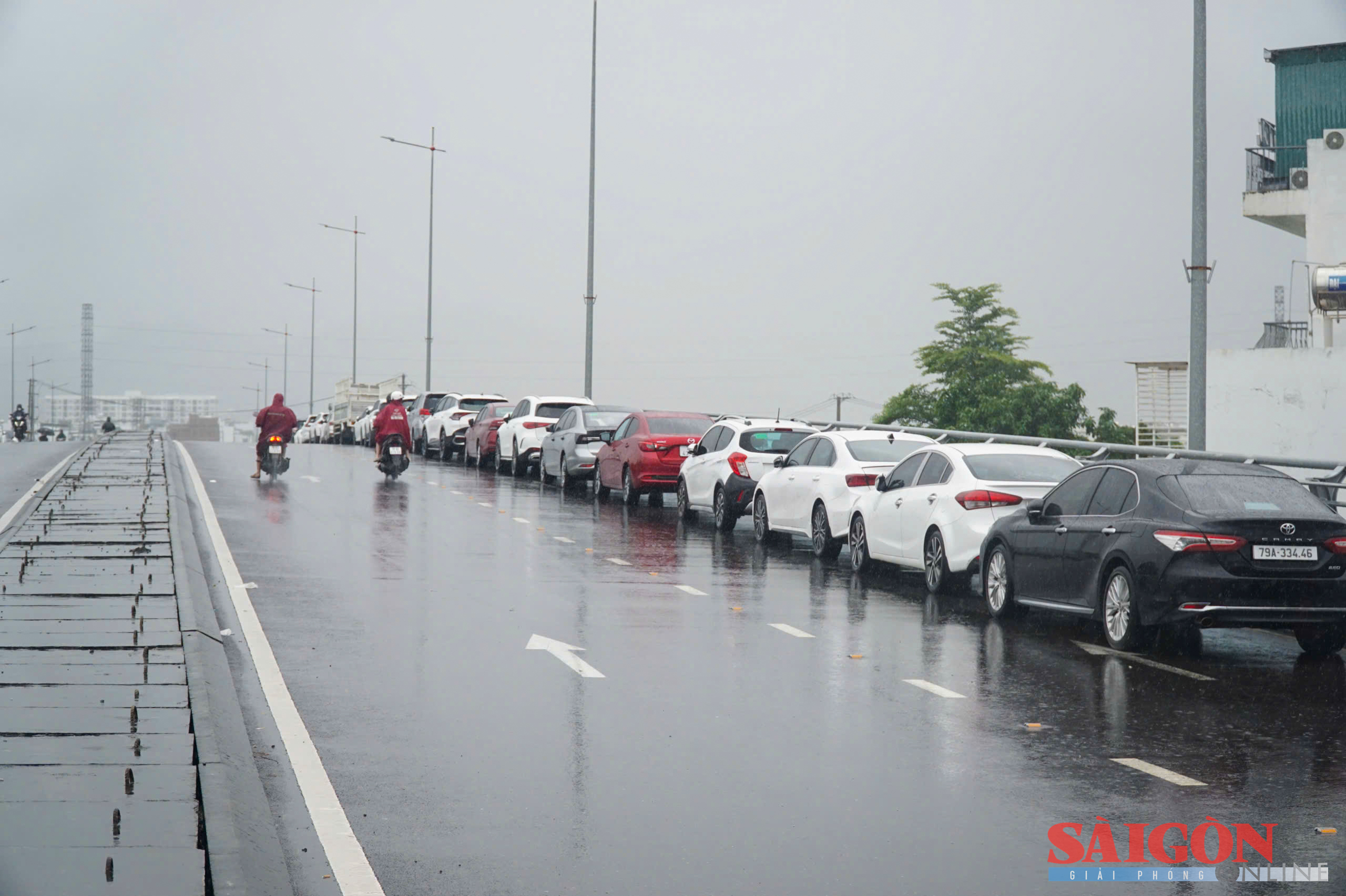 Người dân tập trung tại nút giao cầu vượt Ngọc Hội, không thể di chuyển sang đường 23-10 nối khu vực phía Tây Nha Trang. Ảnh: HIẾU GIANG