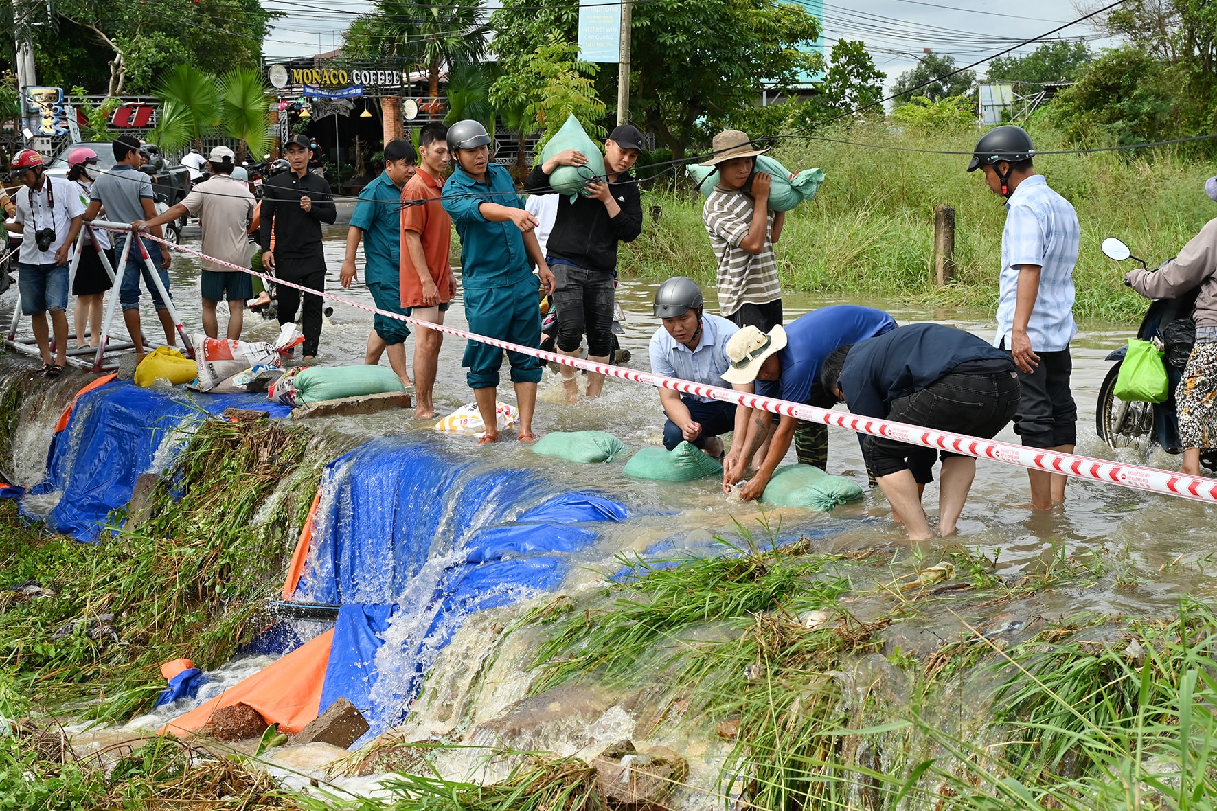 Các lực lượng chức năng dùng bao cát gia cố bảo vệ tuyến đường DT 718 để tránh sạt lở