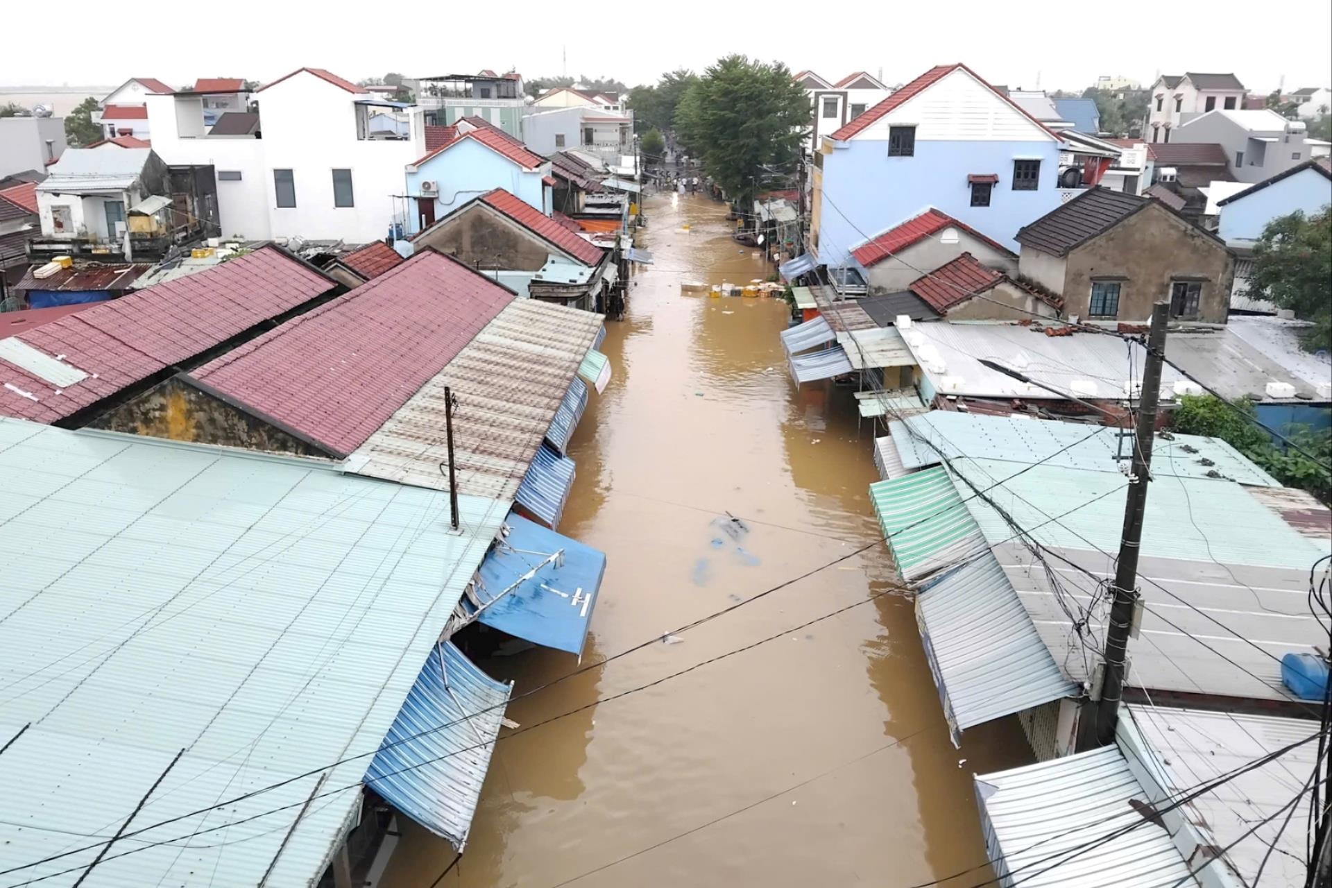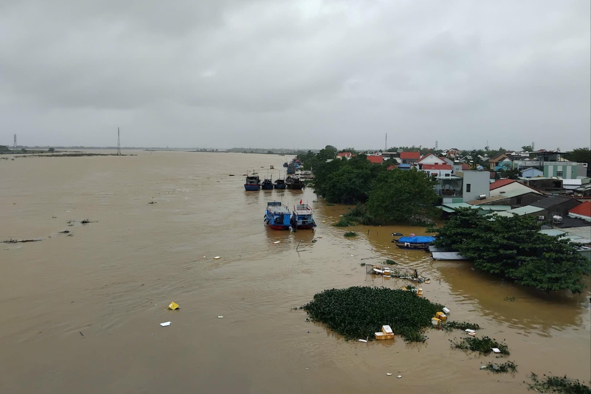 Mực nước sông Thu Bồn dâng cao, tràn bờ khu vực chợ cá Thanh Hà (Hội An), ghe thuyền phải neo sát mái nhà.