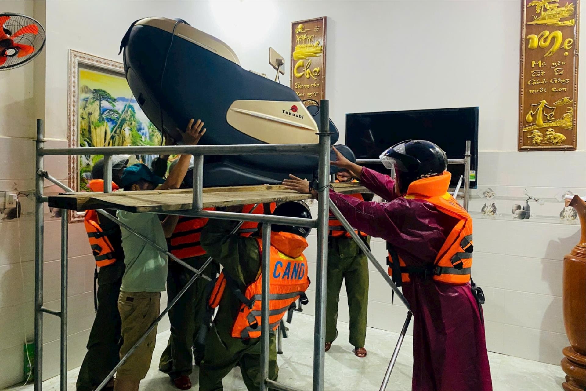 Lực lượng Công an phối hợp hỗ trợ người dân di chuyển vật dụng lên cao tránh lũ.