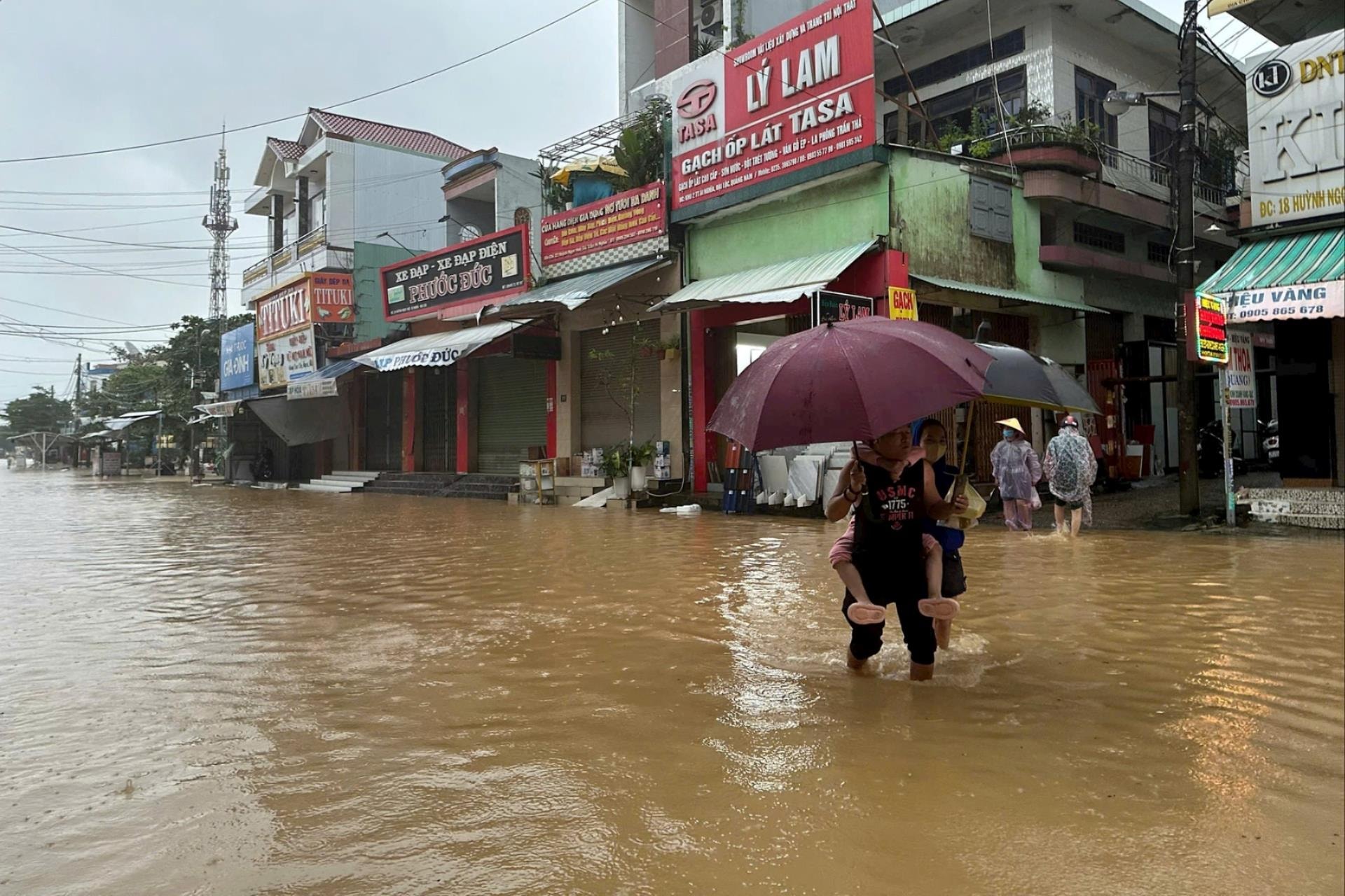 Người dân di chuyển khó khăn giữa dòng nước lũ trên tuyến đường trung tâm xã Đại Lộc.