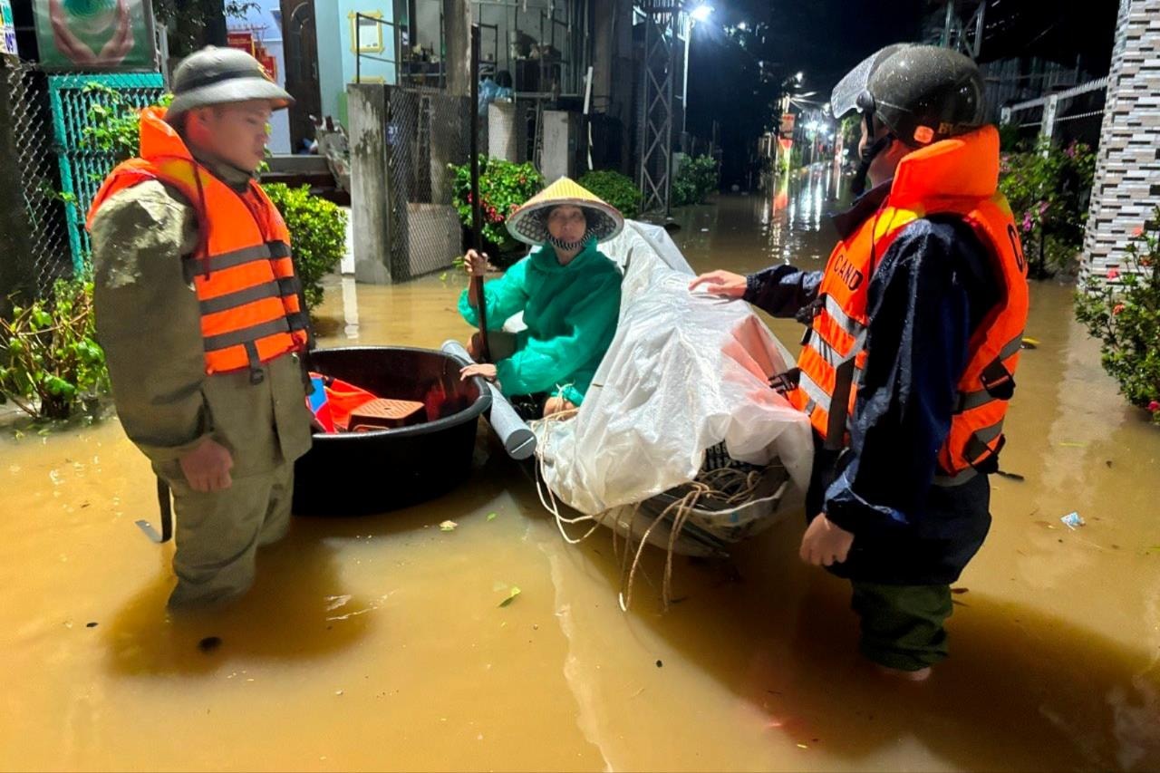 Lực lượng Công an xã hỗ trợ người dân di chuyển bằng ghe đến nơi an toàn trong đêm 26/10.