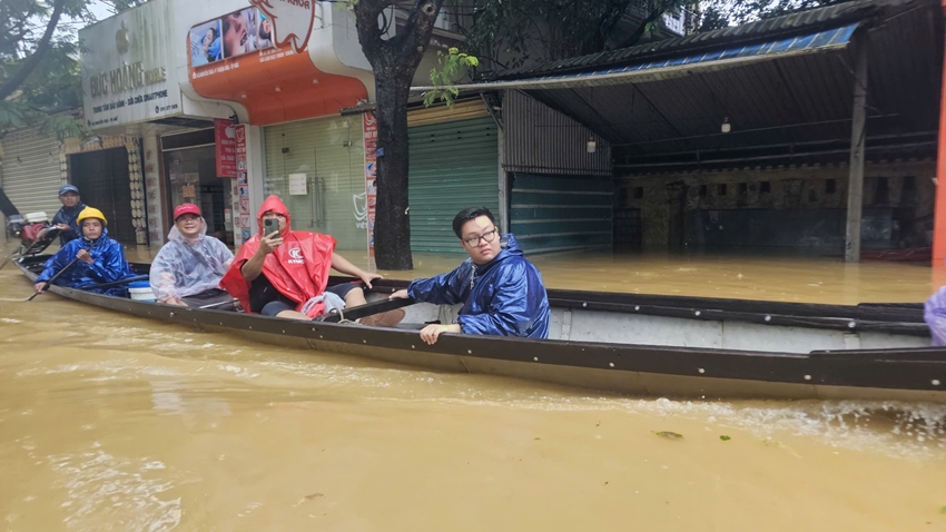 Di chuyển bằng xuồng máy tại khu vực đường Nguyễn Trãi (phường Phú Xuân) do ngập sâu