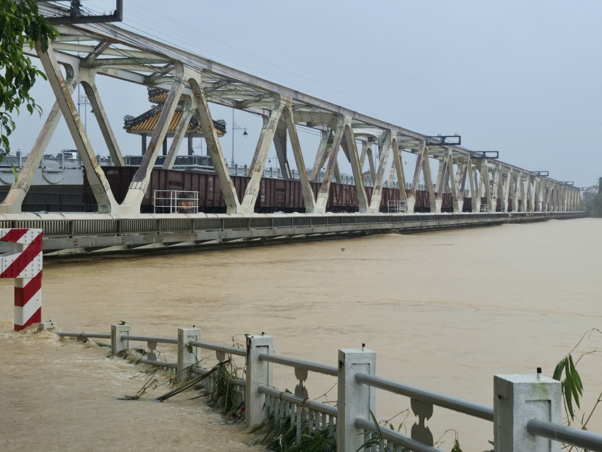 Ngành đường sắt điều động 19 toa xe chở đá lên trên cầu Bạch Hổ nhằm tăng tải trọng, tránh nguy cơ bị cuốn trôi