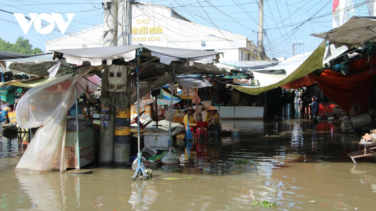 Chợ Huỳnh Hữu Nghĩa có khoảng 500 tiểu thương buôn bán, kinh doanh. Nước ngập sâu khiến nhiều người không còn chỗ để ngồi bán, sức mua cũng giảm mạnh do người dân không thể vào chợ.