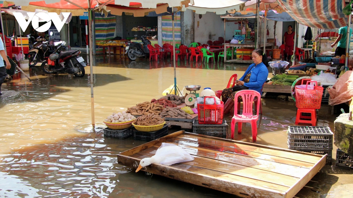 "Nước thủy triều cao nhất là khoảng 2 tuần nay. Một số khu vực chợ thì đã nâng cấp lên 4 tấc rồi mà vẫn ngập như vậy đó, có chỗ ngập lên tới 6 tấc. Bà con không thể ngồi được nữa, đồ trôi hết thì đâu có ai vô ra được" - ông Lõi chia sẻ.