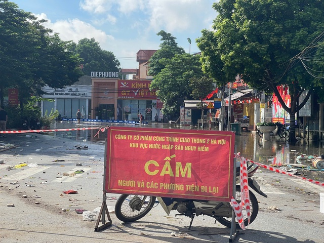 Tại Tây Mỗ, tình trạng ngập vẫn chưa được cải thiện, cơ quan chức năng đã đặt biển cảnh báo nguy hiểm cho người dân.