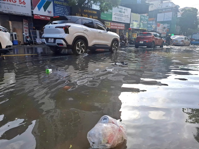 Nước chưa kịp rút hết, rác thải sinh hoạt và cây cối gãy đổ trôi nổi theo dòng nước, gây ô nhiễm môi trường và ảnh hưởng nghiêm trọng đến đời sống người dân. Trong ảnh: Nước vẫn ngập sâu tại đoạn Quốc lộ 70 hướng lên cầu vượt Tây Mỗ.