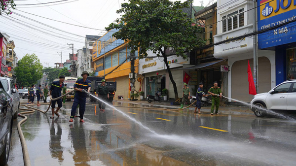 Với phương châm “Nước rút tới đâu, dọn dẹp tới đó”, ngay trong sáng nay (1/10), hàng trăm CBCS Công an các đơn vị và Công an các phường tại địa bàn trung tâm tỉnh khẩn trương xuống các địa bàn nước rút cùng với người dân tổ chức dọn dẹp nhà cửa, nạo vét bùn đất tại các tuyến đường trên địa bàn bị ngập úng; vệ sinh, làm sạch môi trường. Ngay khi dọn dẹp xong, lực lượng phòng cháy chữa cháy sử dụng xe đặc chủng tiến hành tưới rửa lòng đường, hè phố sạch sẽ.