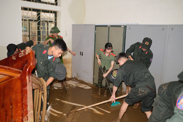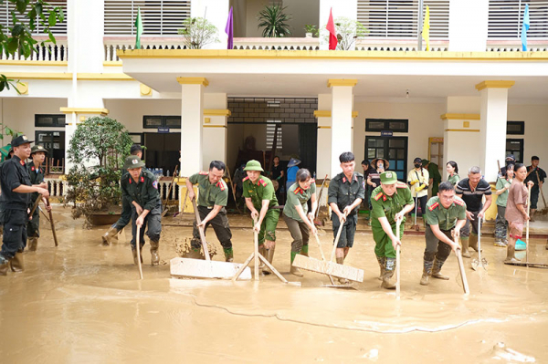 CBCS Công an các cấp cũng đã khẩn trương phối hợp cùng các thầy cô giáo, đoàn thanh niên và phụ huynh học sinh nhanh chóng bắt tay vào công tác khắc phục hậu quả, dọn dẹp cây xanh, thu gom rác thải, kê lại bàn ghế, vệ sinh sân trường, lớp học; đồng thời hỗ trợ sửa chữa, gia cố lại một số hạng mục bị hư hỏng để giúp thầy và trò sớm trở lại trường lớp, ổn định nề nếp học tập.