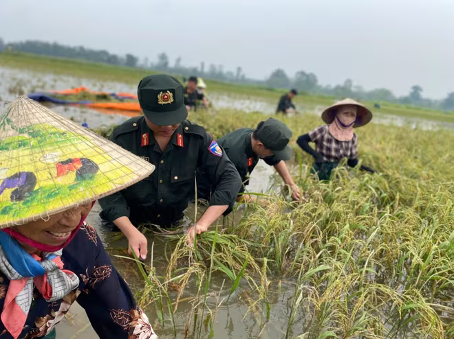 Người vác lúa, người gặt lúa, người vận chuyển xếp lên xe như một mùa gặt thắm đượm tính nhân văn. Những đồng lúa có nơi vẫn ngập nước ngang thân, nếu chỉ mỗi gia đình tự thu hái thì sẽ gặp khó khăn. Nhưng với tinh thần trách nhiệm, sáng tạo của chiến sỹ Công an bằng mọi cách thu hoạch để bà con bớt thiệt hại sẽ không còn là vấn đề khó nữa. Được biết, chỉ trong sáng 11-10, hàng chục thửa ruộng mênh mông đã được gặt xong, vận chuyển về cho mỗi gia đình.