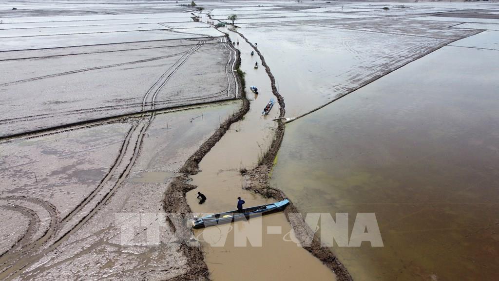 Người dân xã Thường Phước (tỉnh Đồng Tháp) đánh bắt cá trên cánh đồng đã rút cạn nước. Ảnh: Nhựt An - TTXVN