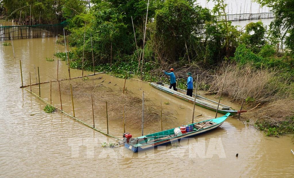 Người dân đặt dớn bắt cá trên tuyến kênh nội đồng dẫn nước từ đồng ruộng ra sông. Ảnh: Nhựt An - TTXVN