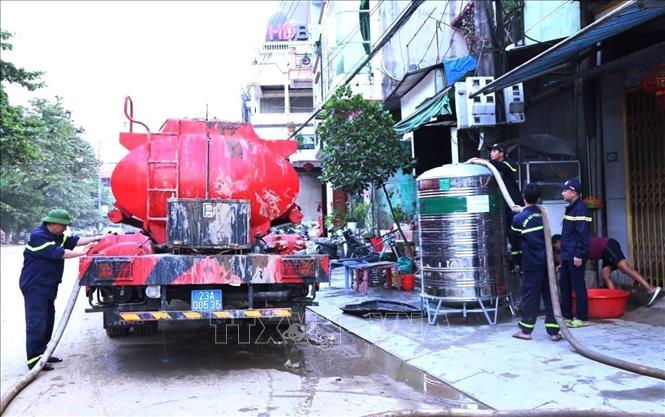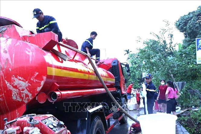 Cán bộ, chiến sĩ phòng Cảnh sát PCCC&CNCH (Công an tỉnh Tuyên Quang) vận hành xe chuyên dụng cấp nước sạch miễn phí cho người dân phường Hà Giang 2, tỉnh Tuyên Quang sau mưa lũ. Ảnh: Phương Thúy/TTXVN phát