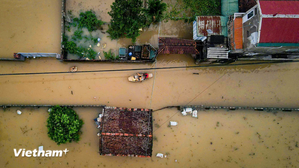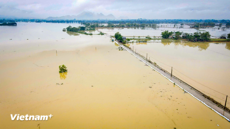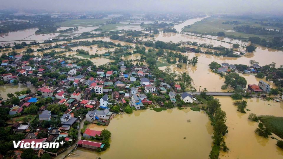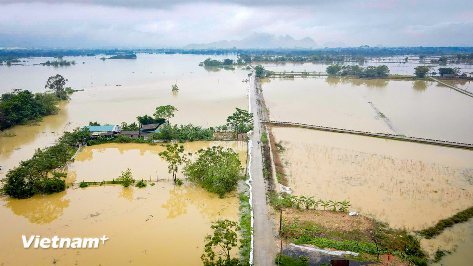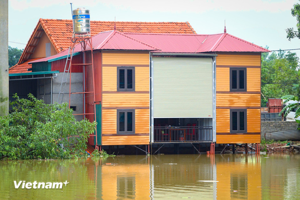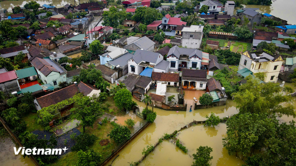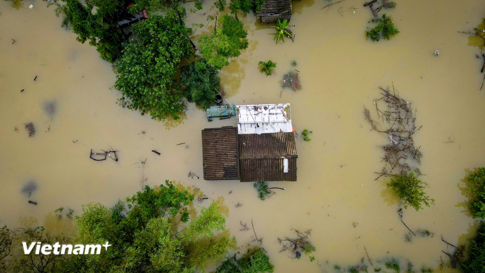 Thậm chí có những vùng trũng nước đã gần ngập tới mái nhà. (Ảnh: Hoài Nam/Vietnam+)