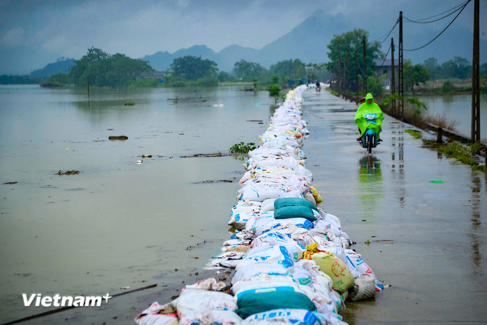 Nước tiếp tục tràn qua đê bao Bùi 2, đoạn qua các xã Xuân Mai, Trần Phú. Để ngăn nước lũ, chính quyền sở tại đã đắp bao tải cát, sỏi cao 3 - 4 tầng. (Ảnh: Hoài Nam/Vietnam+)