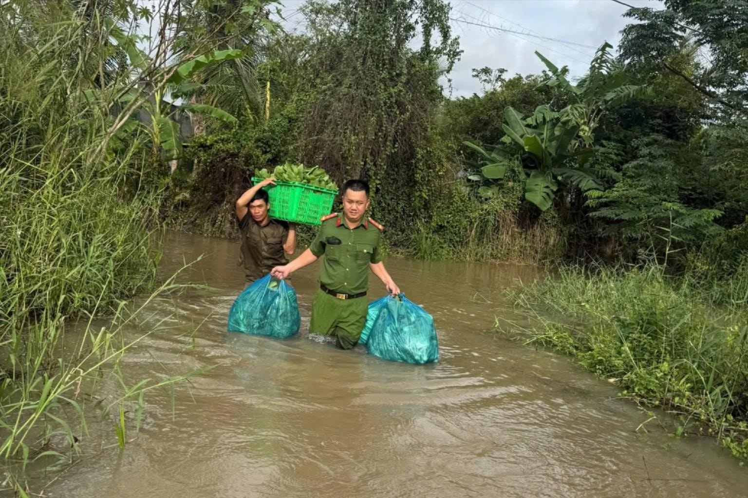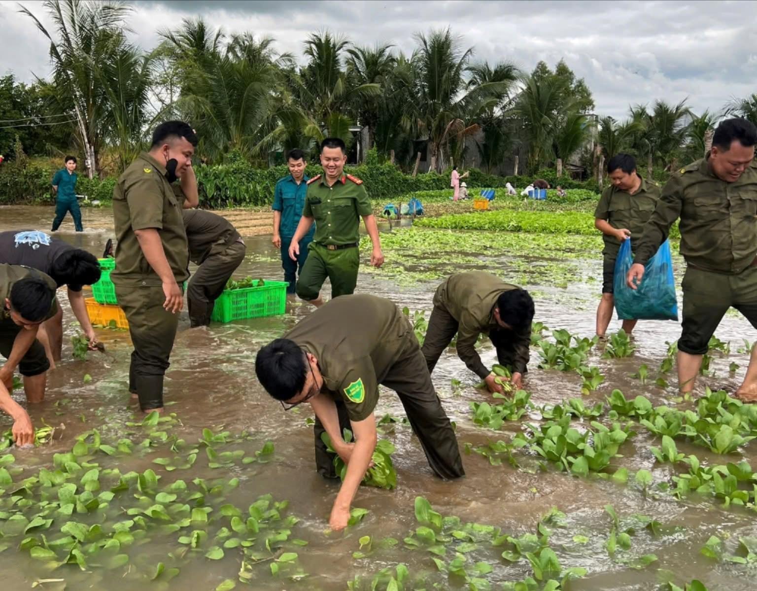 Khoảng 40 cán bộ, chiến sĩ và lực lượng tại chỗ đã phối hợp cùng người dân “chạy đua” với con nước để thu hoạch rau, vận chuyển lên khu vực cao.