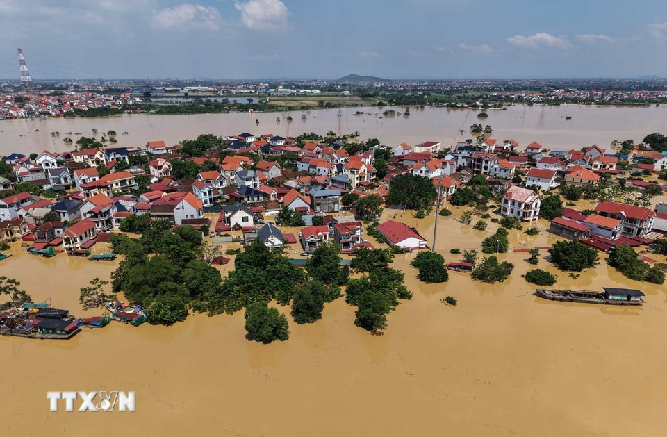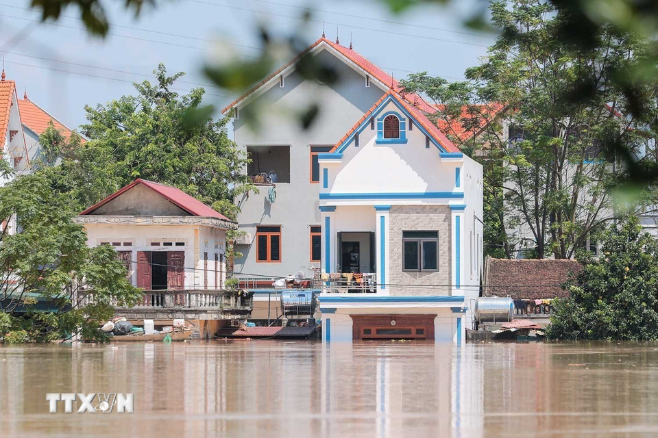 Nhiều hộ dân của xã Hợp Thịnh (tỉnh Bắc Ninh) sống ven sông Cầu bị ngập sâu hơn 3m do nước sông dâng cao bất thường. (Ảnh: Hoàng Hiếu/TTXVN)
