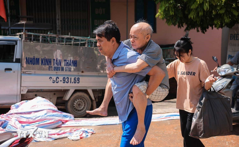 Người dân được di chuyển đến nơi an toàn khi nước sông Cầu dâng cao. (Ảnh: Hoàng Hiếu/TTXVN)