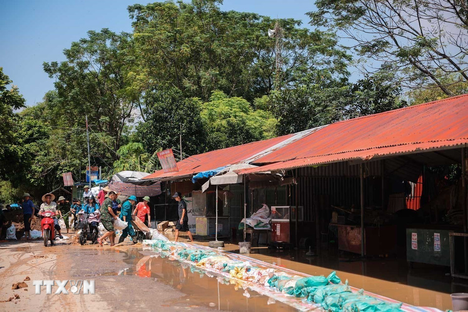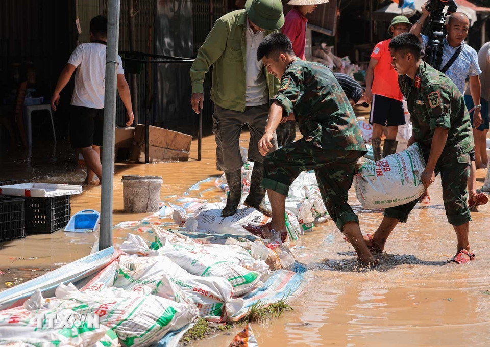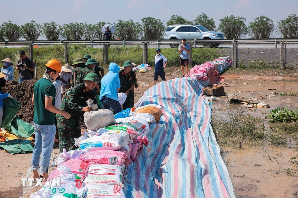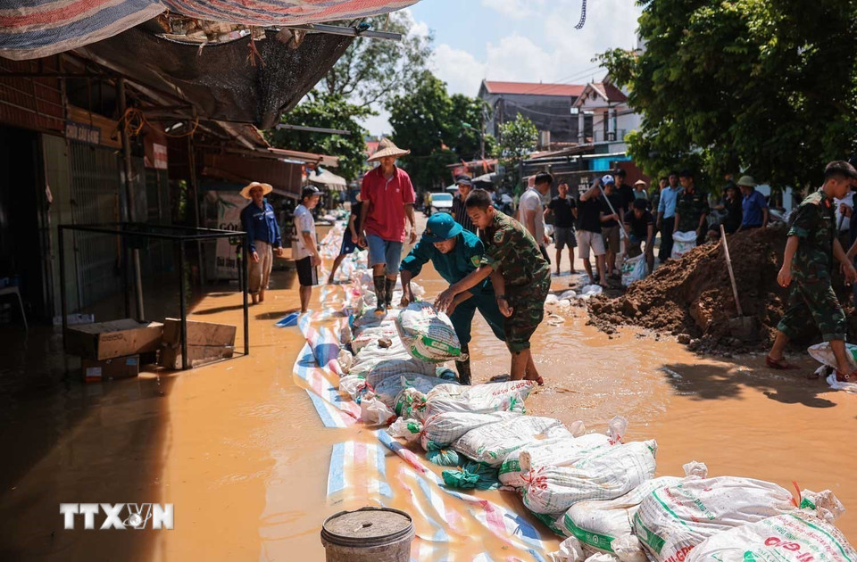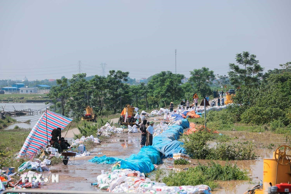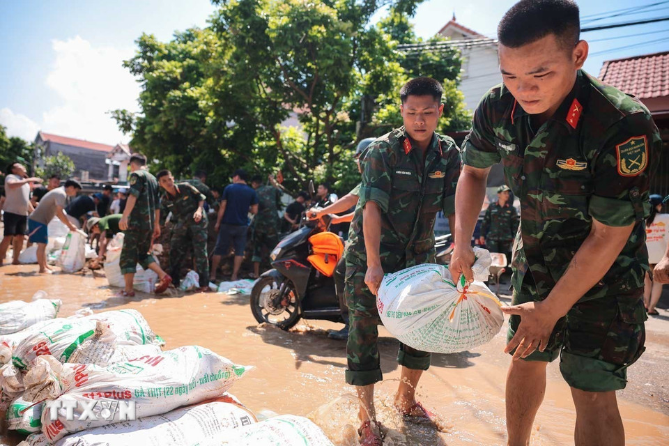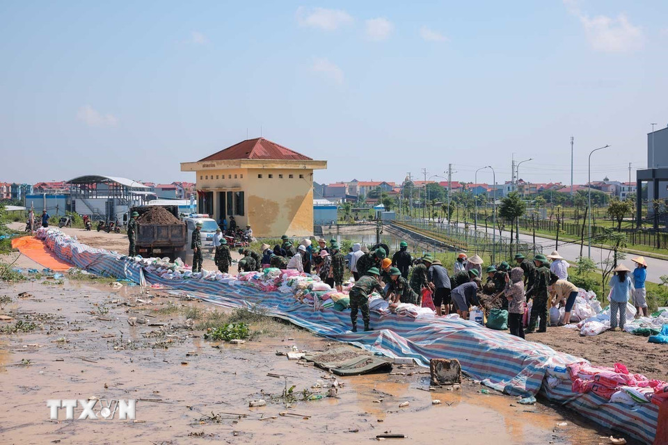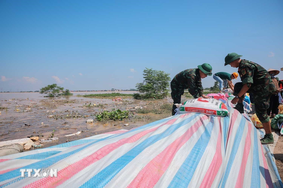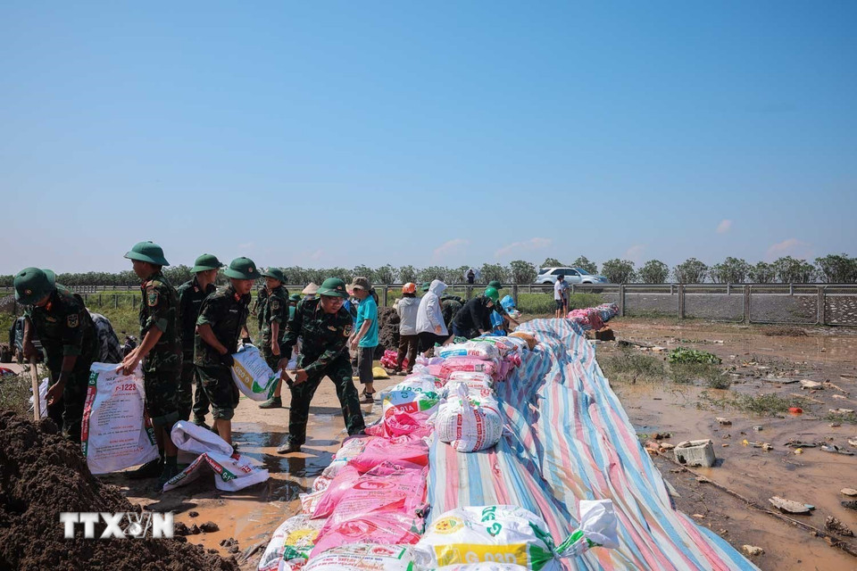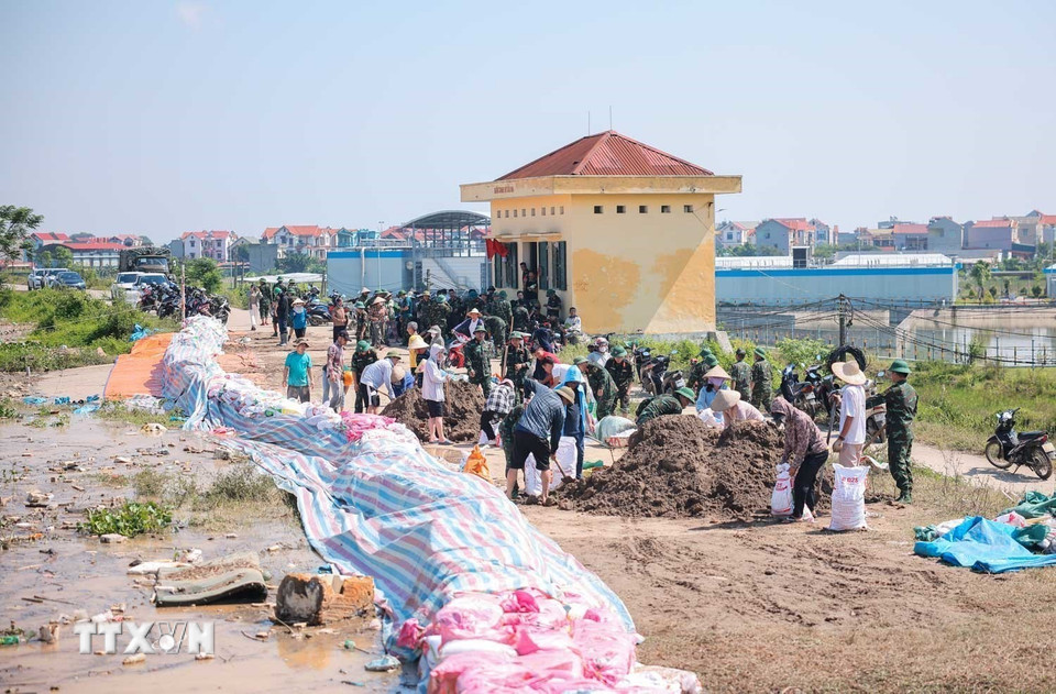 Bộ đội Trung đoàn 833 và Ban chỉ huy khu vực phòng thủ số 4 (Bộ Chỉ huy quân sự tỉnh Bắc Ninh) và nhân dân đang phối hợp gia cố đê thôn Đoài, xã Tam Giang (Bắc Ninh). (Ảnh: Hoàng Hiếu/TTXVN)