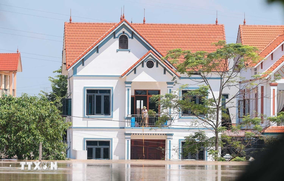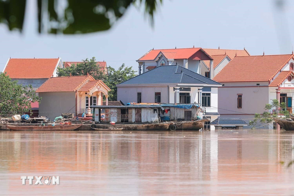 Nhiều hộ dân thôn Ngô Đạo, xã Đa Phúc (Hà Nội) ven sông Cầu hiện bị ngập úng nặng. (Ảnh: Hoàng Hiếu/TTXVN)