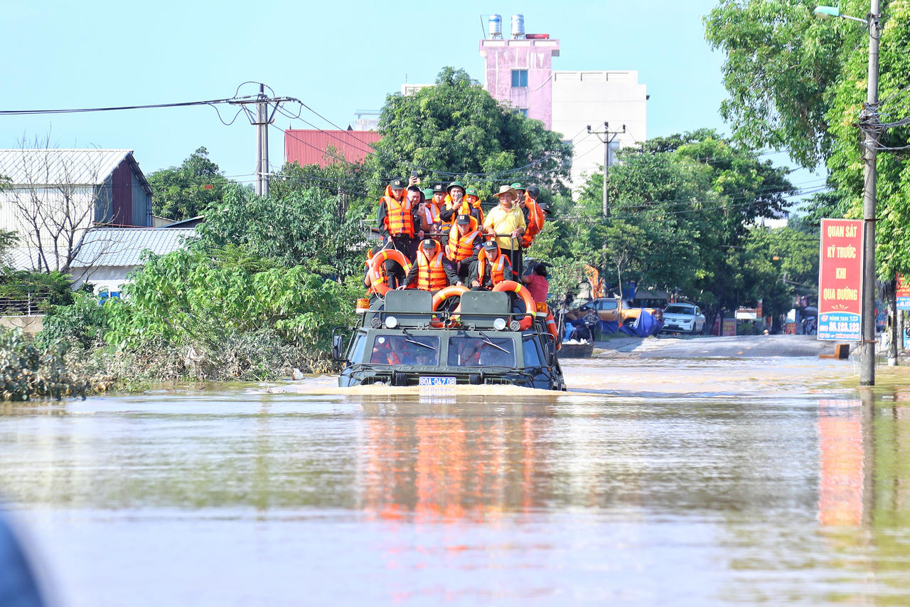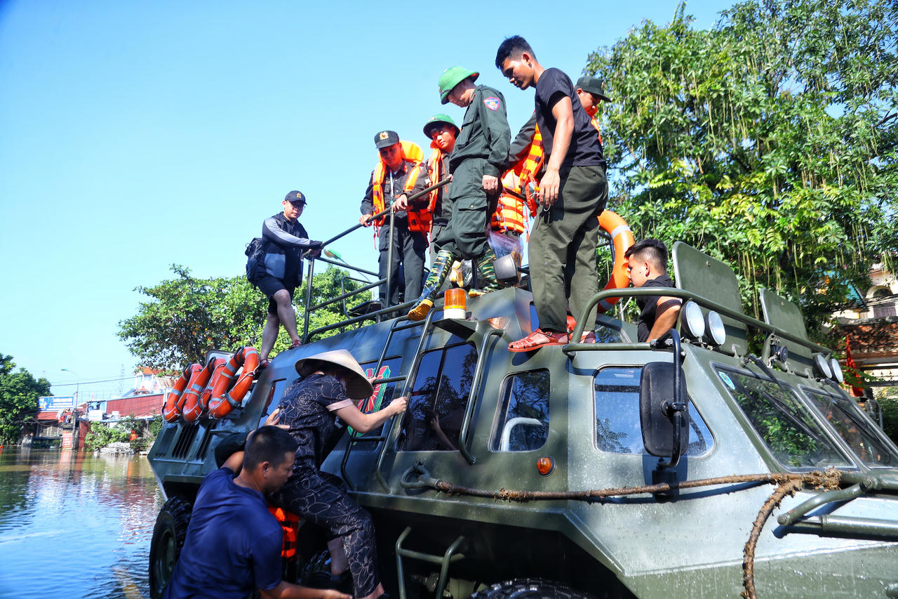 Dàn xe đặc chủng liên tục lội nước đưa người dân ra vị trí an toàn.