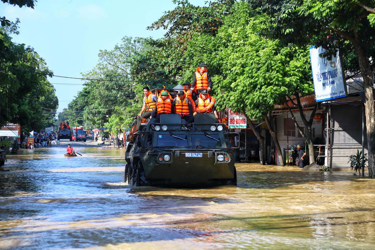 Hàng trăm cán bộ chiến sĩ di chuyển đến khu vực ngập để ứng cứu người dân.