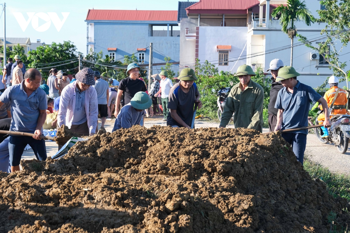 “Sáng 8/10 khi phát hiện khu vực đê trũng xuống, lại nằm ở vị trí xung yếu, nên người dân tự giác mang thêm cuốc, xẻng để đắp đất, gia cố đê. Trước bão, lực lượng chức năng và người dân đã kè một lần nhưng sau đó, một đoạn ngắn đê gặp sự cố. Do vậy, thôn quyết định huy động bà con hỗ trợ, gọi thêm xe ô tô chở đất khắc phục vấn đề. Về lâu dài, thôn kiến nghị có thêm hỗ trợ gia cố đê vì đê đã có dấu hiệu ngấm nước”, ông Hóa thông tin.