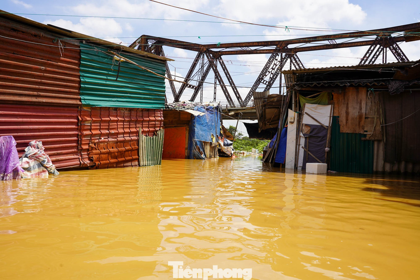 Do mực nước sông Hồng dâng cao, một số ngôi nhà dưới chân cầu Long Biên bị ngập sâu, khu vực bãi giữa bị cô lập.