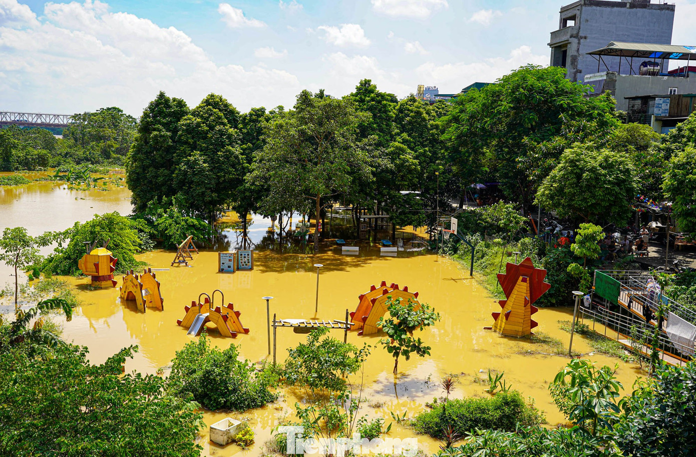 Sân chơi Phúc Tân sát cầu Long Biên cũng bị ngập sâu, mặt nước chuyển màu vàng do phù sa từ sông cuốn theo.