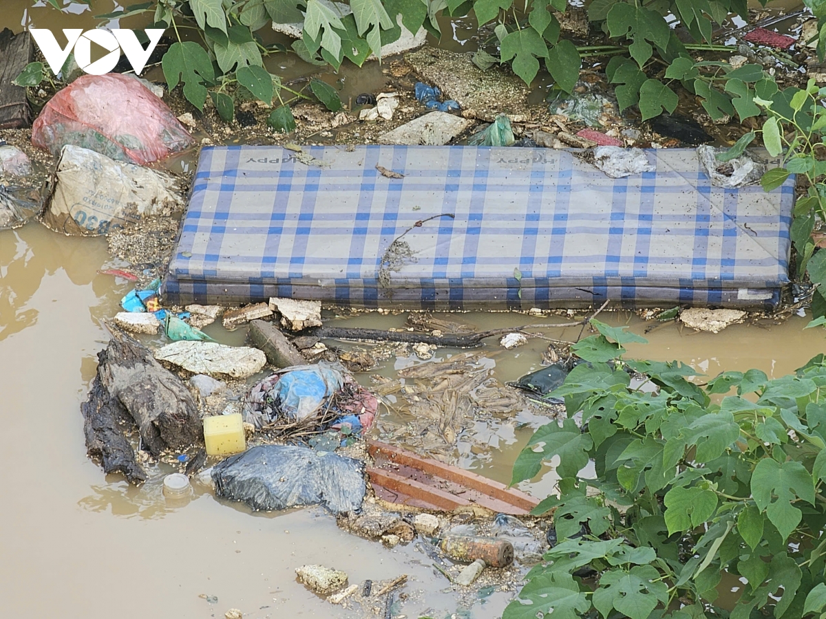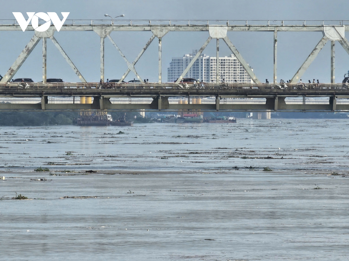 Sông Hồng đoạn chảy qua cầu Long Biên, sáng 2/10 đỏ ngầu cuồn cuộn phù sa. Nước lũ dâng cao, bao quanh như muốn nuốt trọn cây cầu Long Biên. Dòng lũ từ thượng nguồn đổ về không chỉ nhấn chìm nhà cửa, vườn tược mà còn kéo theo những khối gỗ, cành cây và rác thải trôi dạt khắp mặt sông - tạo thành mối nguy tắc nghẽn, ô nhiễm và làm ảnh hưởng tới đời sống sinh hoạt, sản xuất của các khu dân cư ven sông.