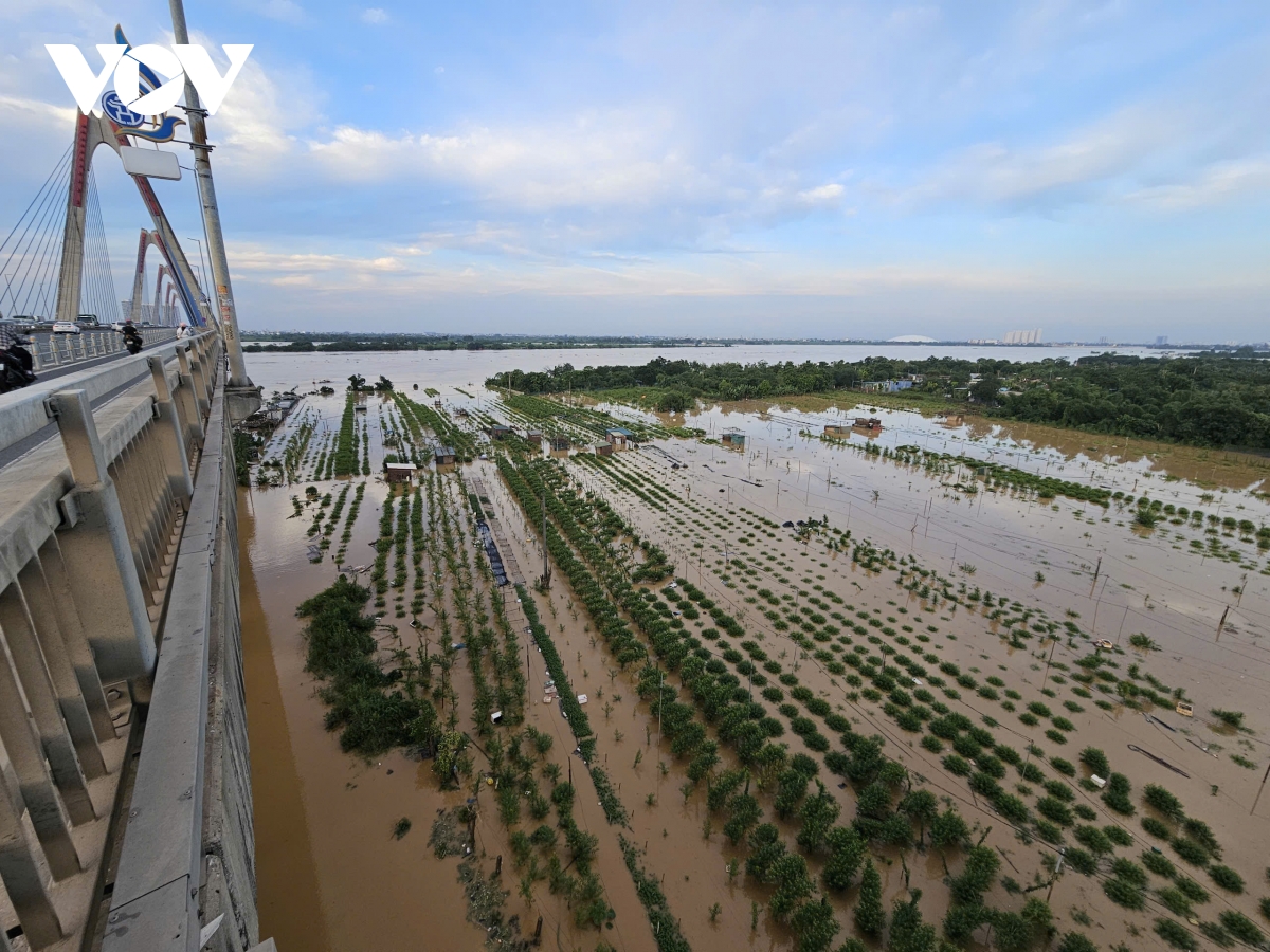 Nước sông Hồng dâng cao do bão số 10 khiến nhiều diện tích trồng cây cảnh của làng đào Phú Thượng-Nhật Tân và làng quất Tứ Liên, một số vùng ven sông người dân trồng cây ăn trái bị ngập nặng.