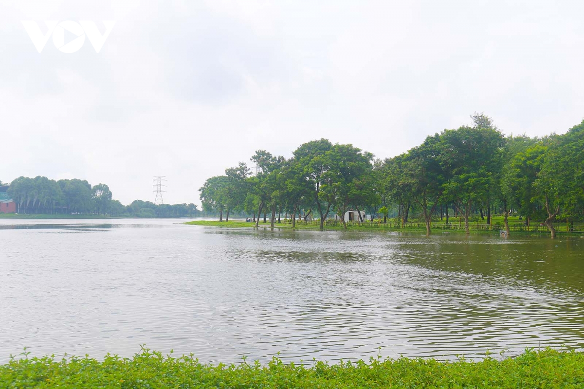 Mực nước mấp mé mặt đường tại khu vực quanh công viên Yên Sở.