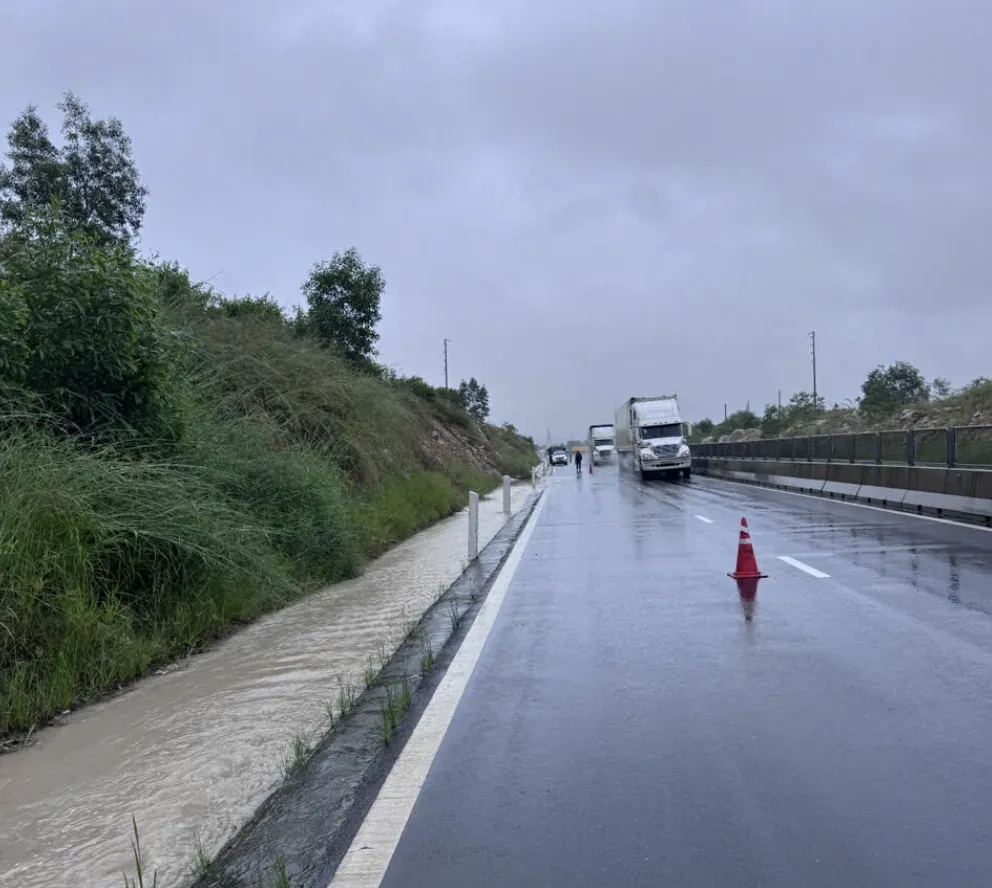 Lượng mưa lớn khiến nước tràn lên cao tốc gây khó khăn cho các phương tiện qua lại. Ảnh: CTV