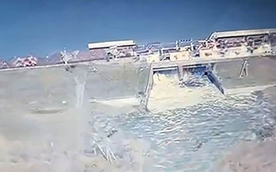 Video: Nước liên tục tràn ra ở phần cửa xả bị hư hại sau đòn tấn công của Ukraine. Nguồn: Telegraph.