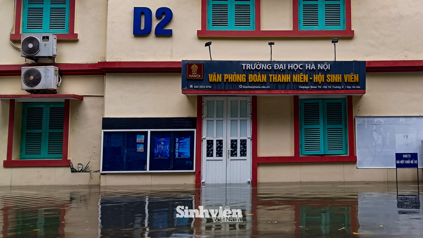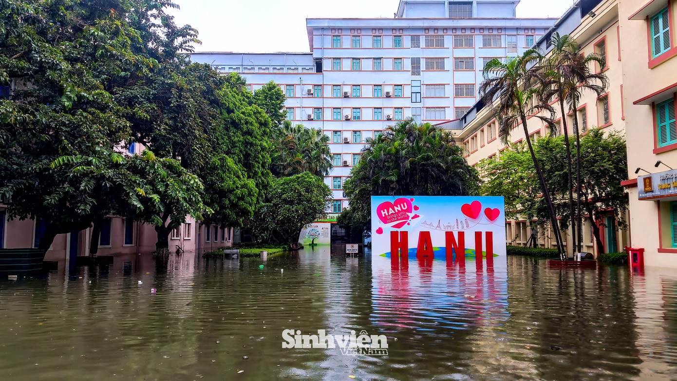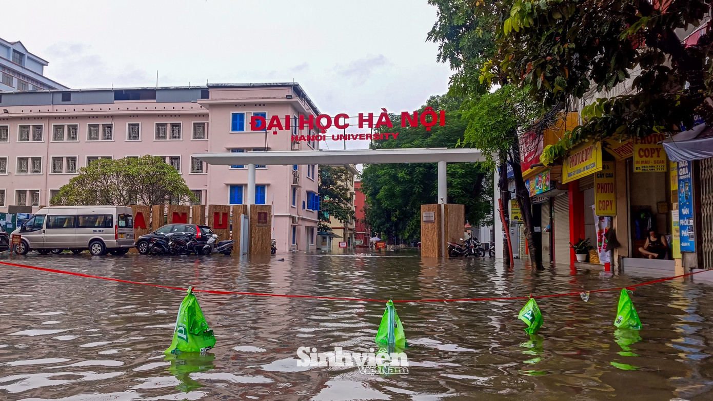 Ghi nhận thực tế, hiện nay toàn bộ khuôn viên và con đường dẫn vào trường Đại học Hà Nội đều ngập sâu. Mực nước dao động từ 20cm đến nơi sâu nhất lên tới 70cm.