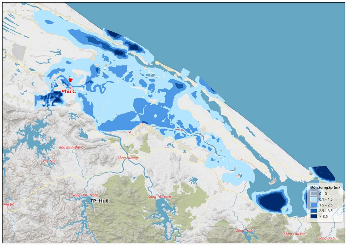 Bản đồ nguy cơ ngập lụt hạ lưu sông Bồ, sông Hương (TP Huế). (Nguồn: NCHMF)