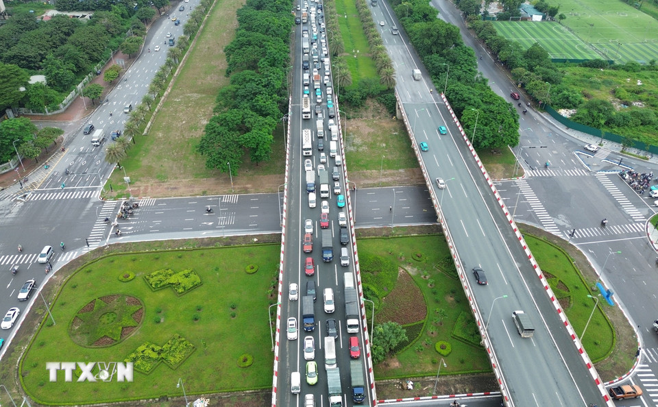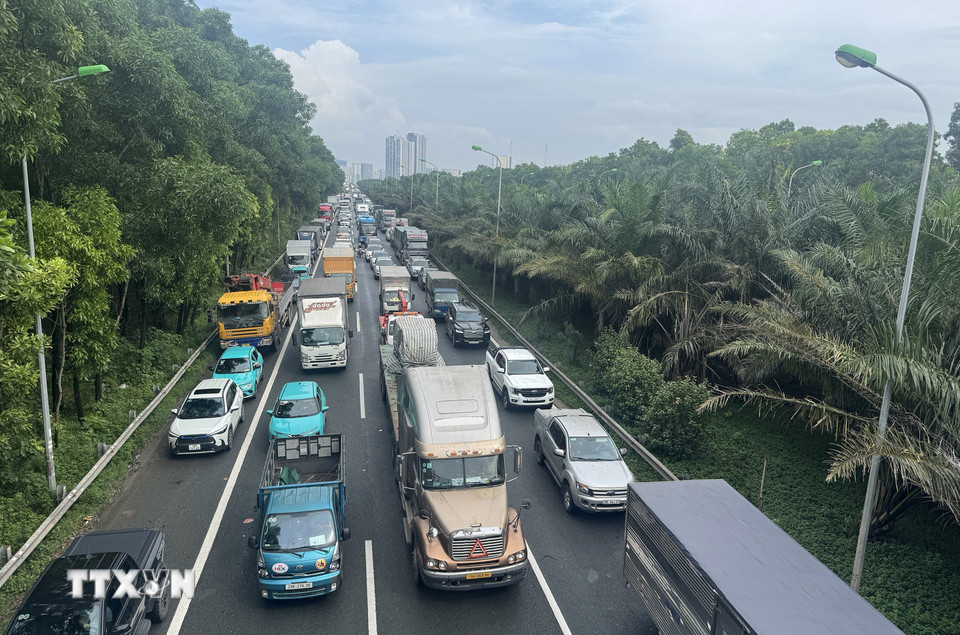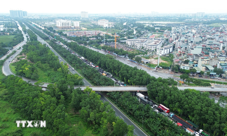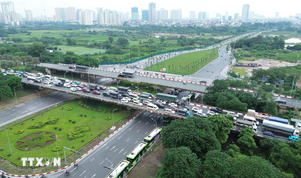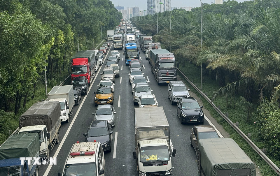 Cao tốc Hà Nội-Hòa Lạc hướng từ trung tâm ra ùn tắc kéo dài hàng km. (Ảnh: Quốc Khánh/TTXVN)